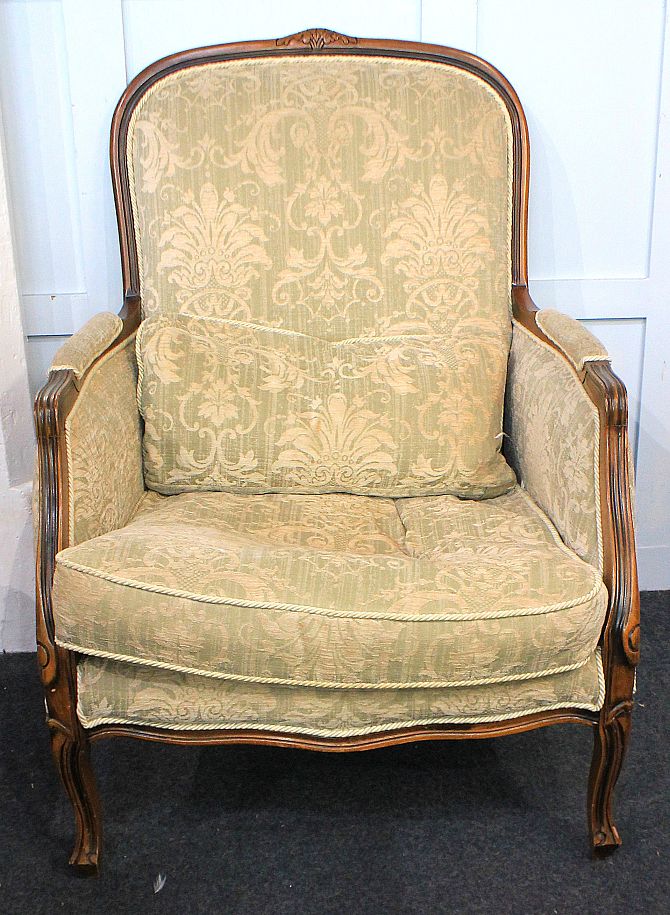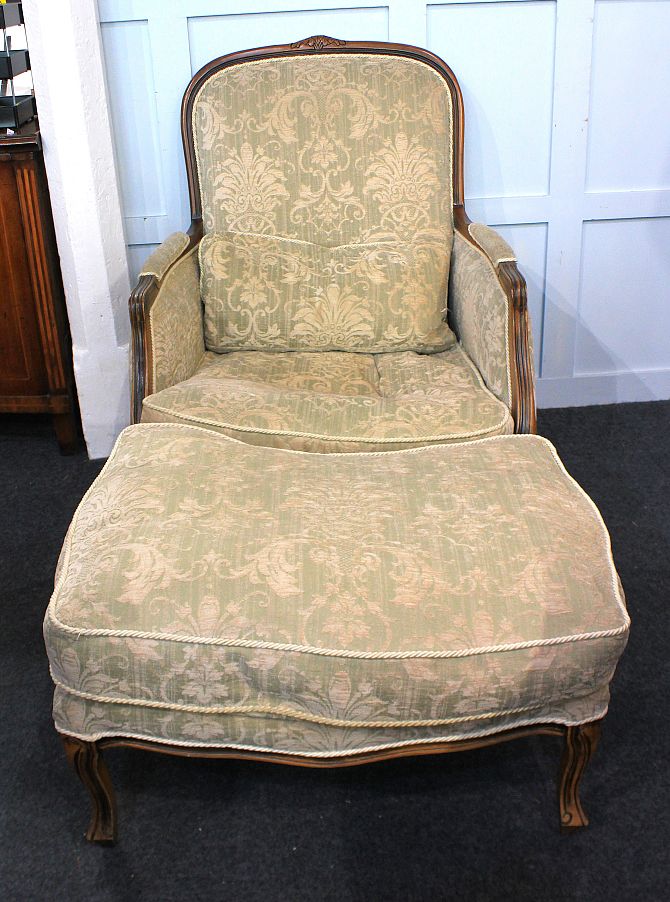 A 20th century Louis XV style armchair and matching stool, with pale green damask patterned upholstery, on carved cabriole legs, chair 103cm high, 83cm deep, 79cm wide, stool 47cm high, 58cm deep, 77cm long