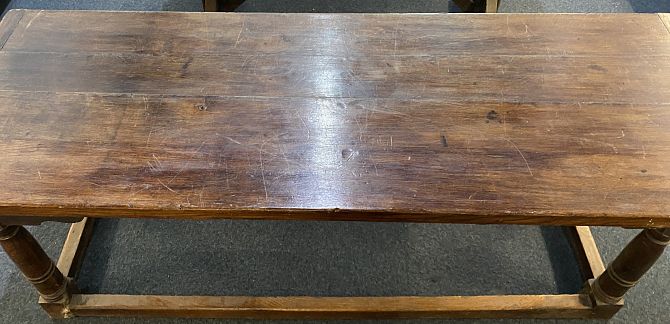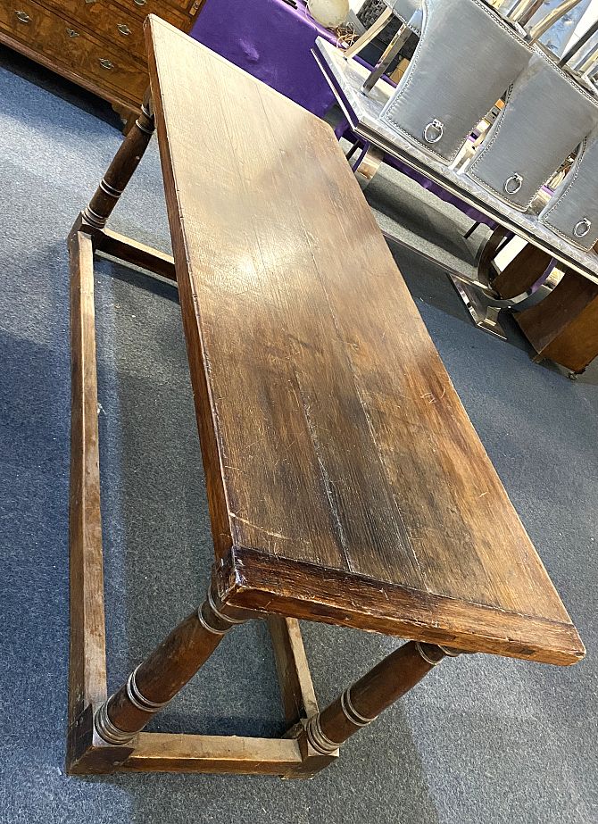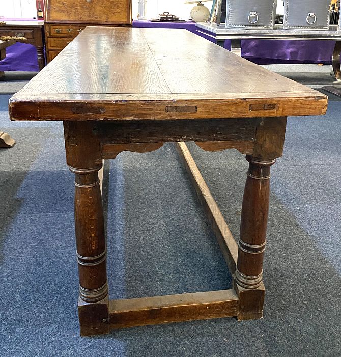 A solid oak refectory table in an 18th century style, the thick four plank top with cleated ends, raised on turned baluster supports and block feet united by low stretchers, 216cm by 75cm.