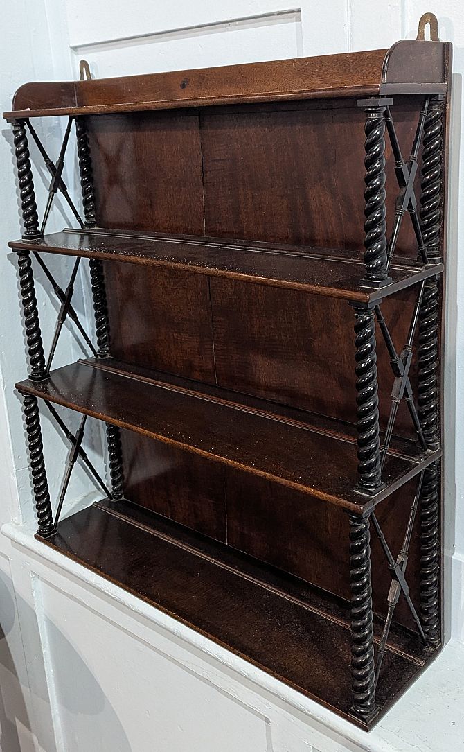 A set of Victorian mahogany hanging wall shelves with X frame sides and bobbin turned supports height 72cm, width 65cm