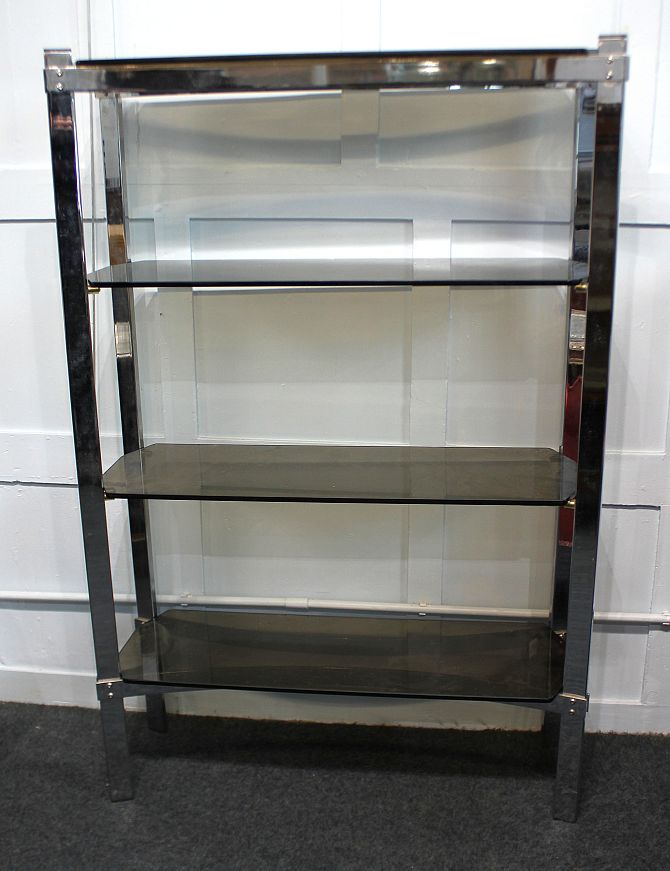 A vintage Merrow Associates chrome and smoked glass shelf unit / display stand, 94cm wide by 100cm high by 31cm deep/