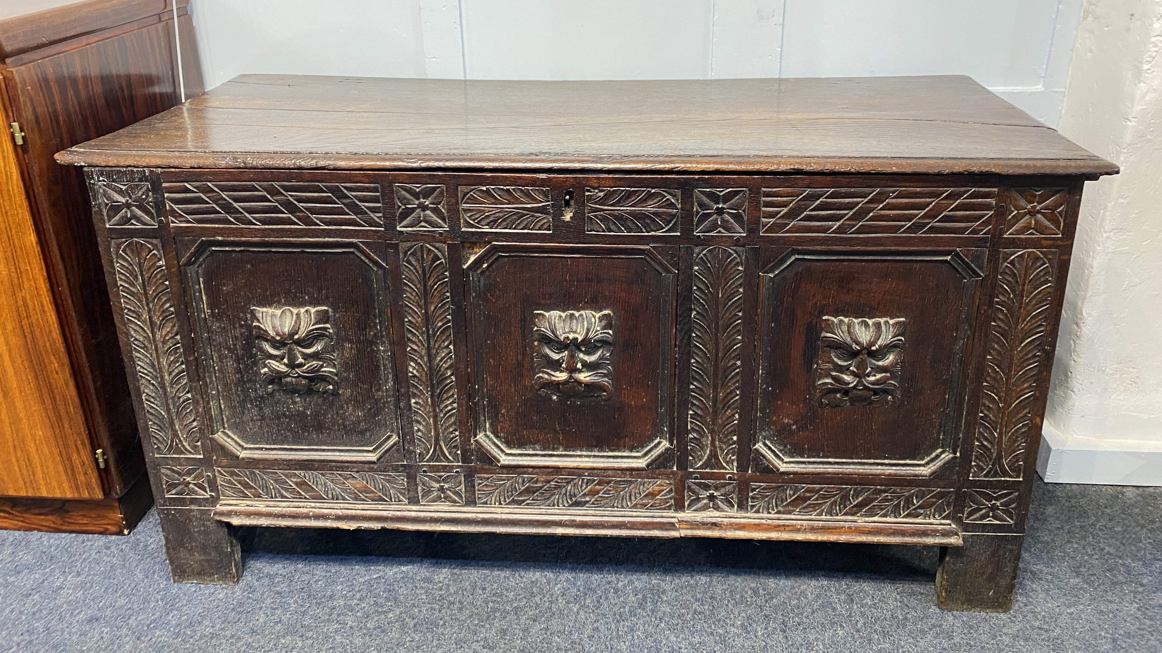 An 18th century carved and panelled oak coffer, with hinged lid, green man masks, and raised on stile feet, 130cm wide by 52cm deep by 68cm high, (af).