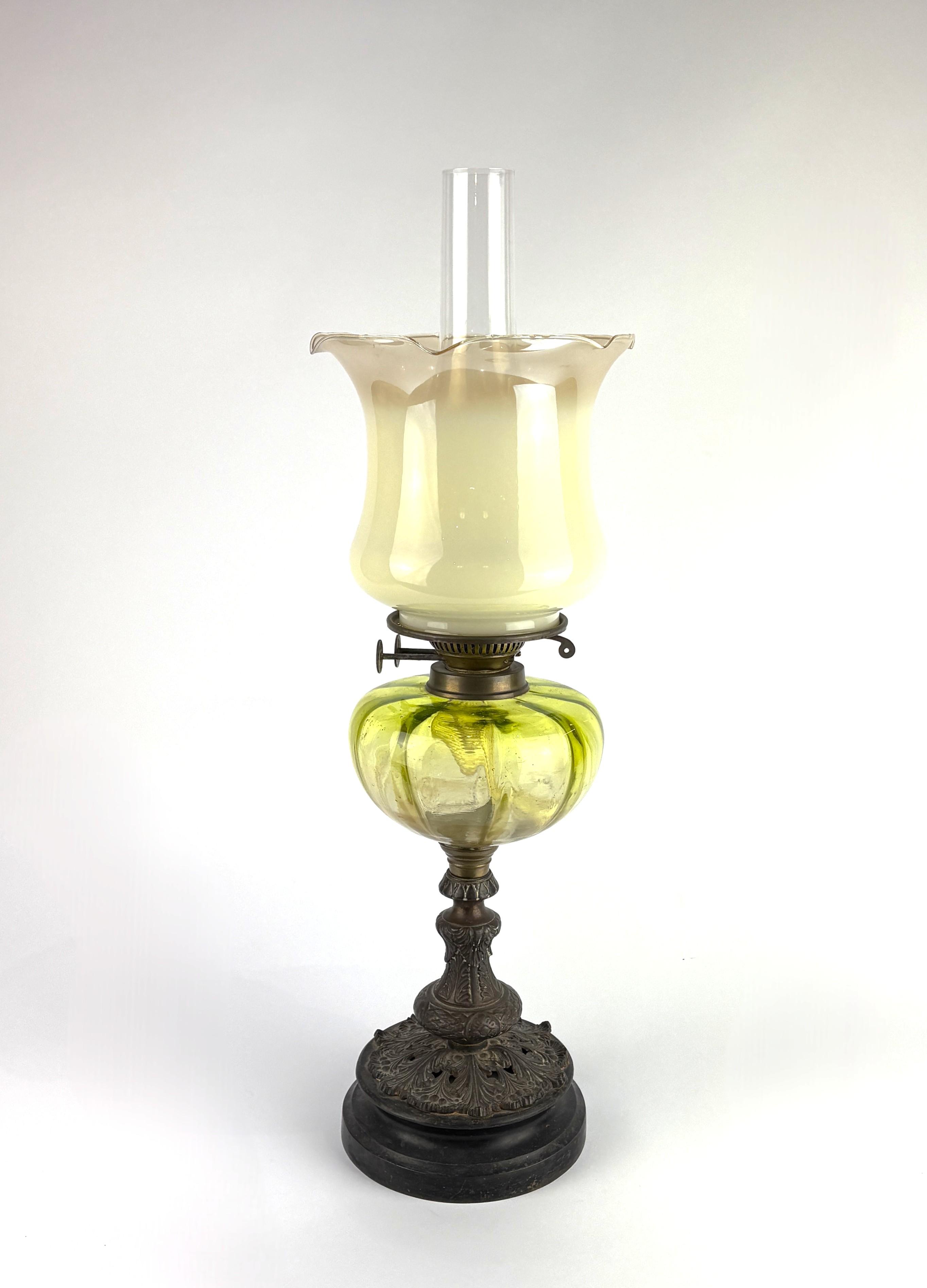 A Victorian oil lamp with green glass well and white glass shade, brass column support on black socle base 63cm high including funnel