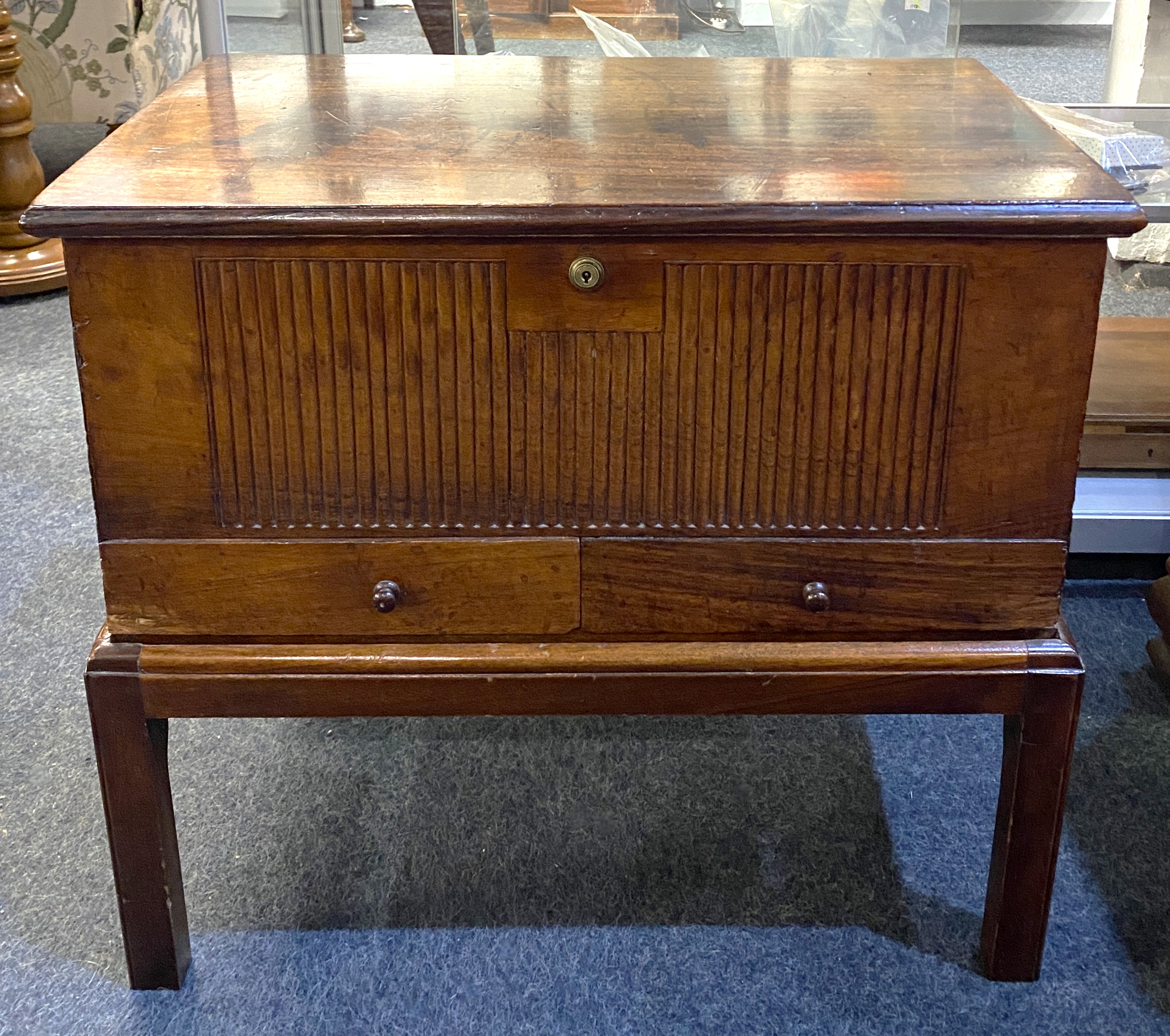 An antique and later box on associated stand, the box with hinged rosewood lid enclosing fitted interior, reeded front and sides and two small drawers, with Braman lock (no key), height including stand 56cm, width 62cm, depth 39cm