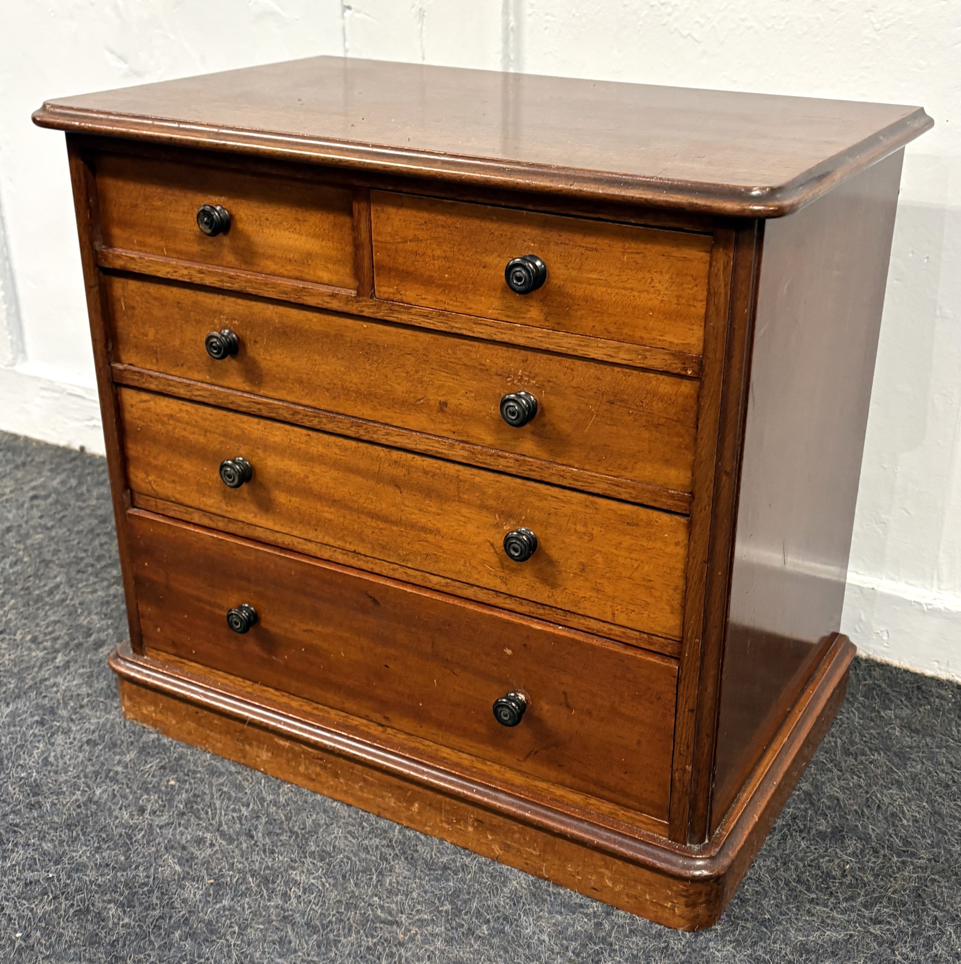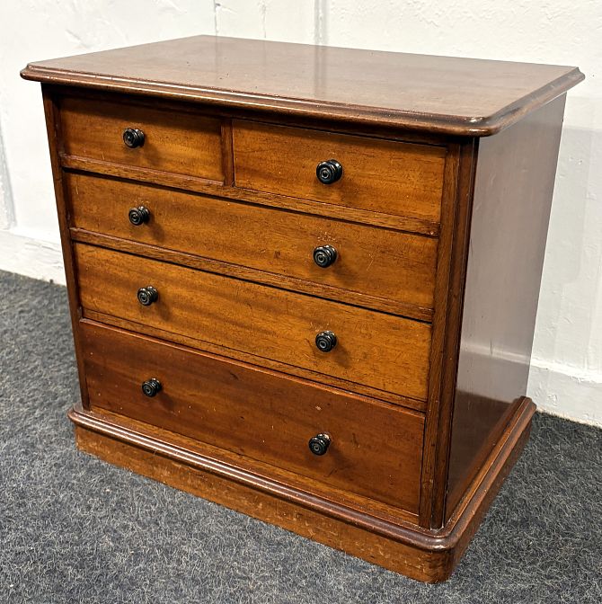 A 19th century mahogany apprentice's chest, the top with moulded edges and rounded front corners, above two short and three long graduated draswders, fitted with turned knob handles, raised on a plinth base, 46cm wide by 29cm deep by 43cm high.