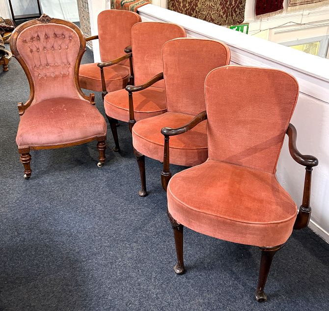 A Victorian button back upholstered nursing chair on turned supports to ceramic castors, together with a set of four Louis XV style elbow chairs