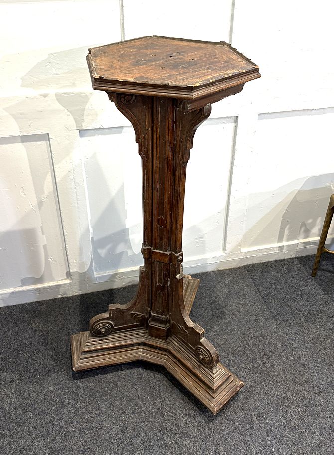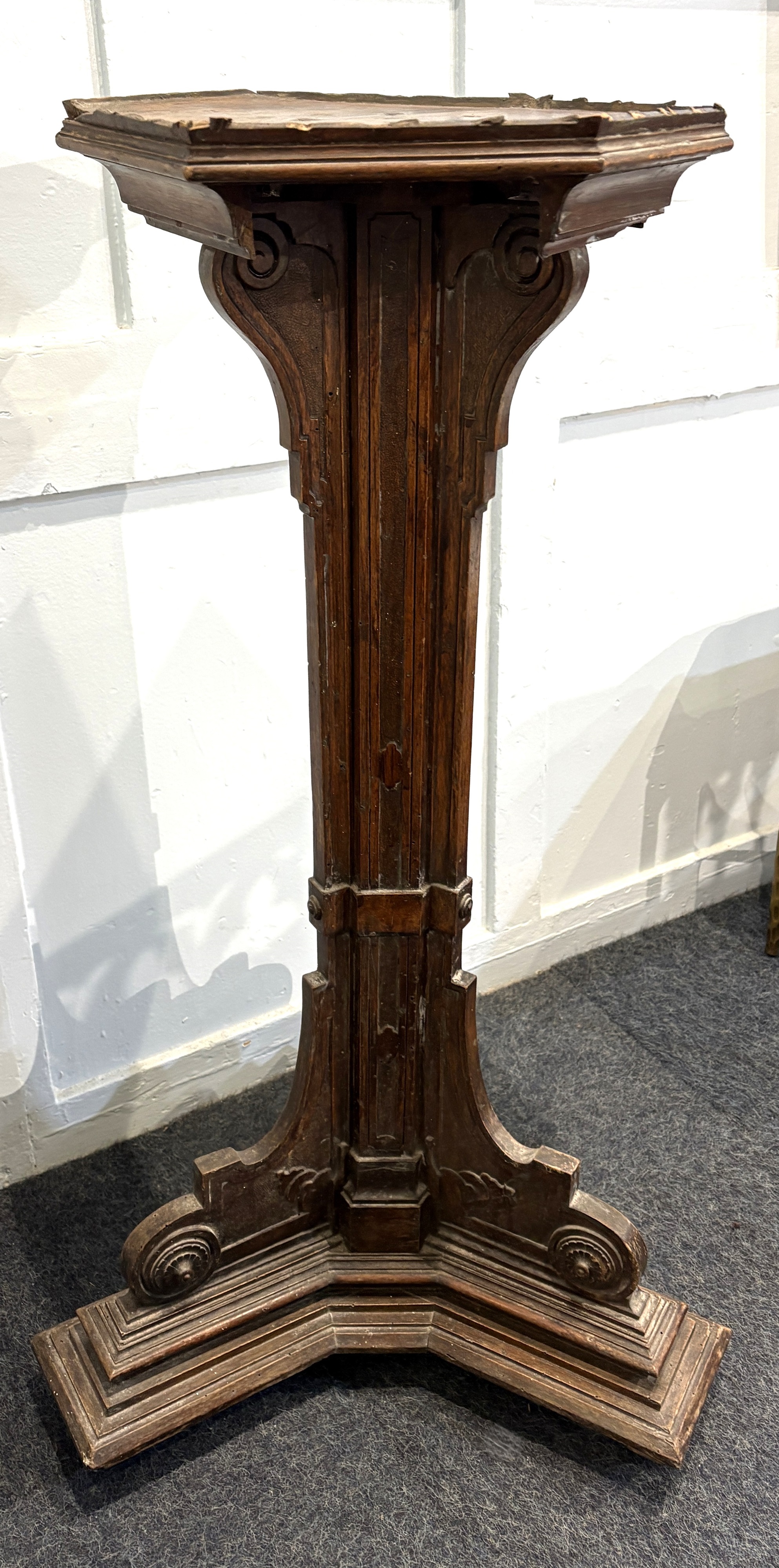 A 19th century carved Gothic pedestal with hexagonal top on scroll carved stem to triform platform base, height 97cm, diameter of top 39cm
