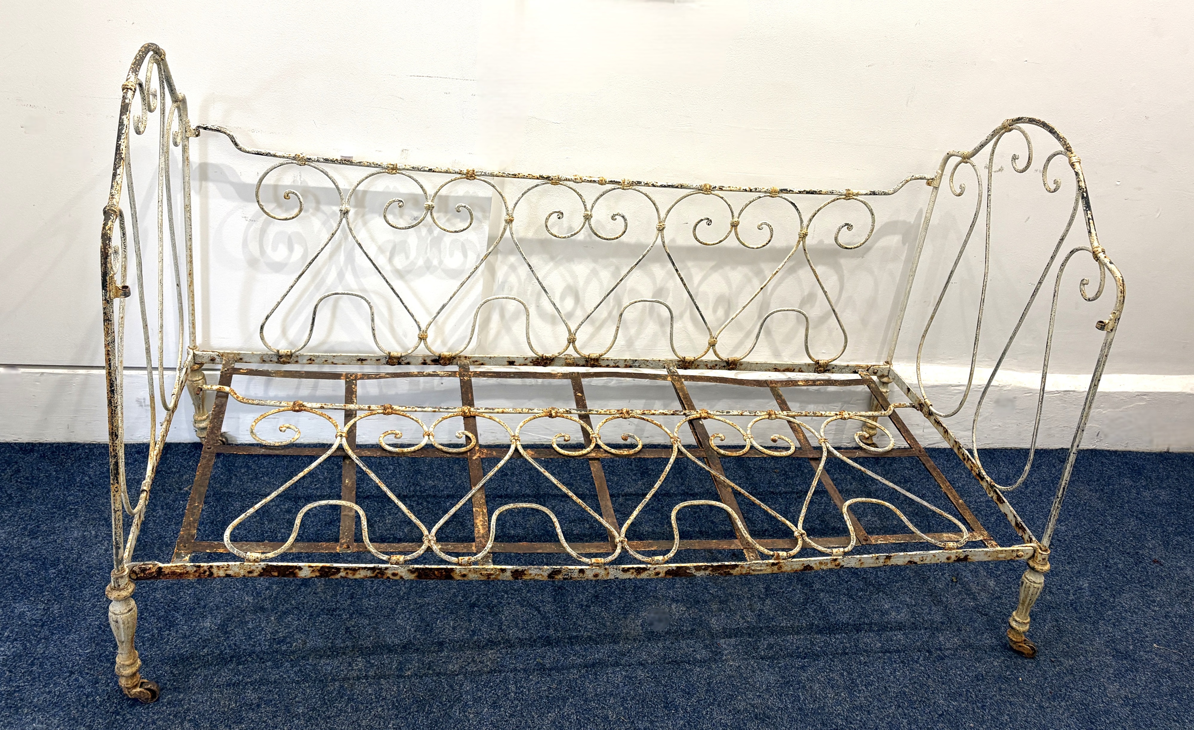 A French white painted metal day bed / cot height 91cm, 154cm wide
