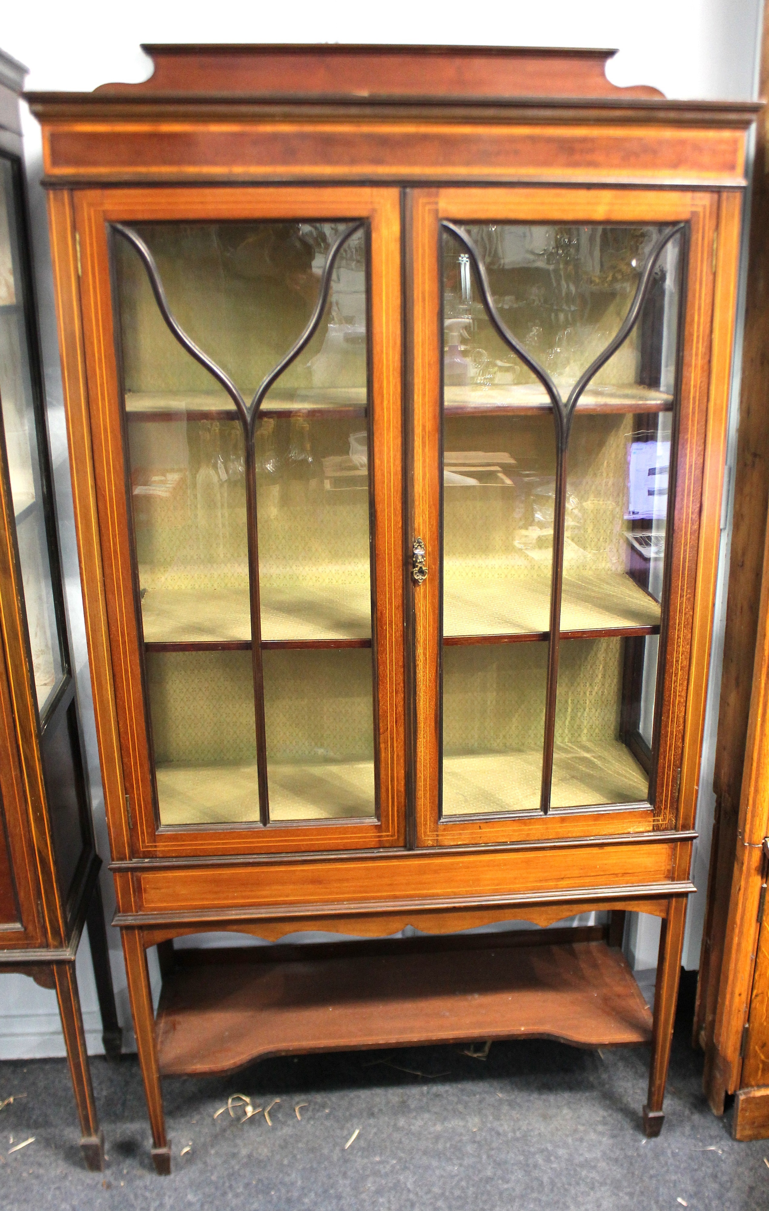 An Edwardian inlaid mahogany display cabinet with satinwood banding and boxwood stringing, the shaped glass pnelled doors enclosing a lined fitted interior, above an open undertier, raised oin tapered square supports terminating on spade feet, 92cm wide, 175cm high, 36cm deep