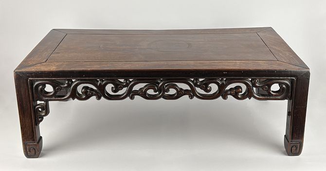 A Chinese carved hardwood low altar table with carved and pierced frieze, on square carved legs height 26cm, width 76cm, depth 42cm