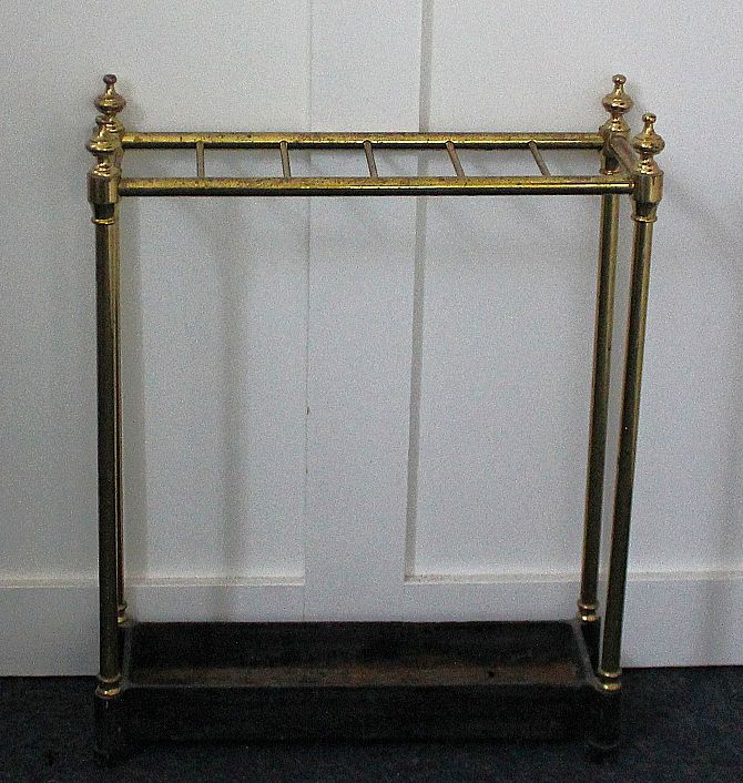 A rectangular brass stick / umbrella stand with six-section top and cast iron drip tray, height 59cm, width 46cm, depth 15cm