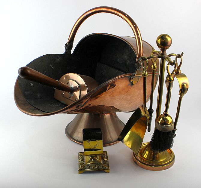 A copper coal scuttle and shovel, a small brass fireside companion set containing four tools, and a brass matchbox holder