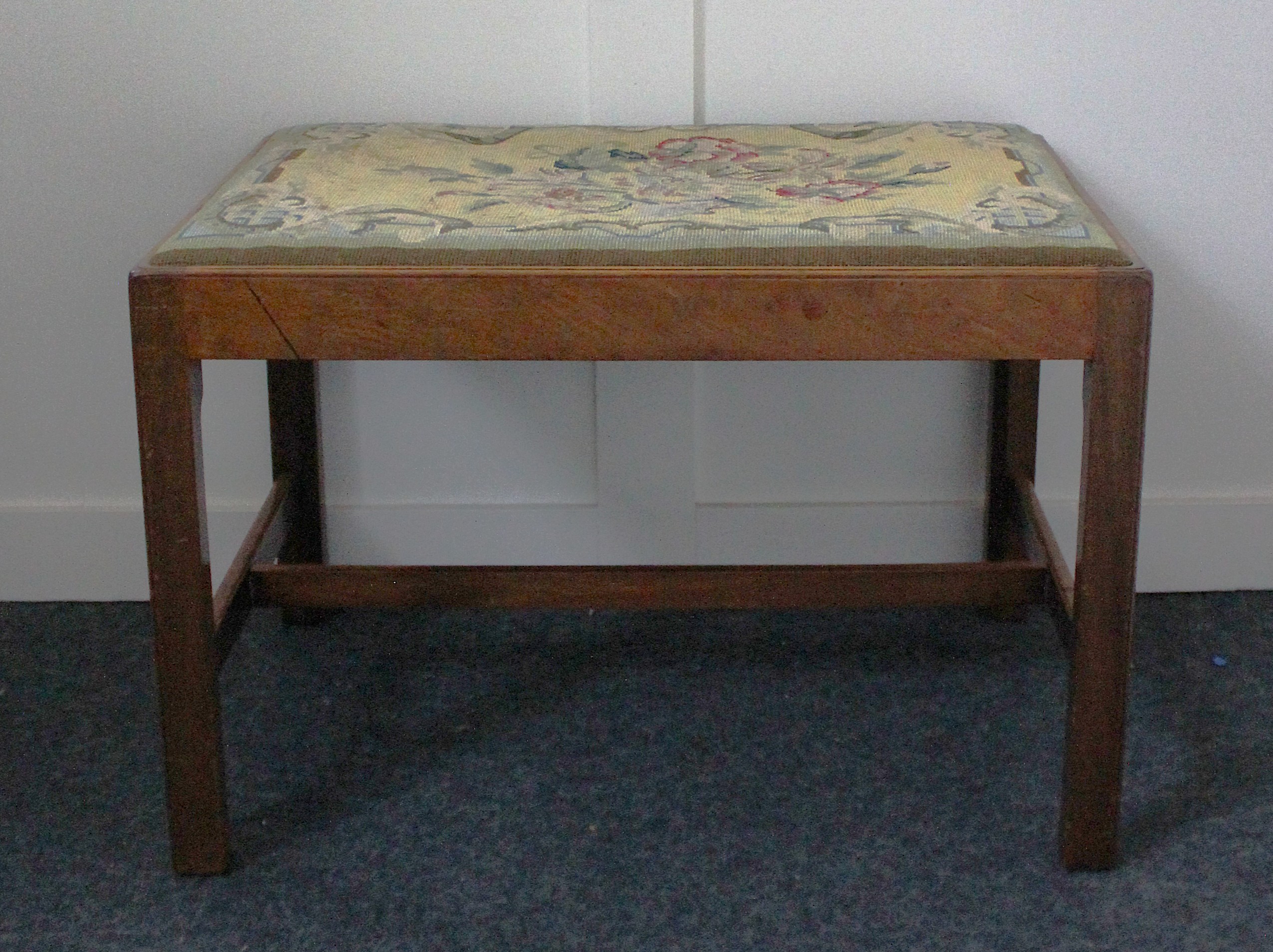 A large 19th century rectangular mahogany stool, with attractive floral needlework upholstered drop-in top on square chamfered legs with uniting stretcher height 46cm, depth 51cm, width 70cm