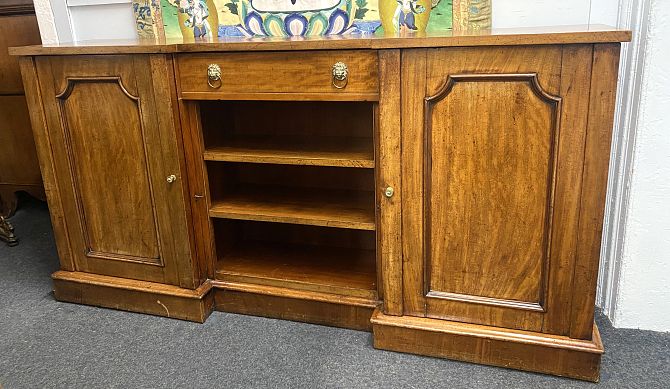 A 19th century mahogany reverse breakfront side cabinet, fitted with a central drawer with lions mask handles, above open shelves, flanked on either side by a panelled cupboard door enclosing drawers, slides and shelves, raised on a plinth base, 174cm wide by 39cm deep by 89cm high.
