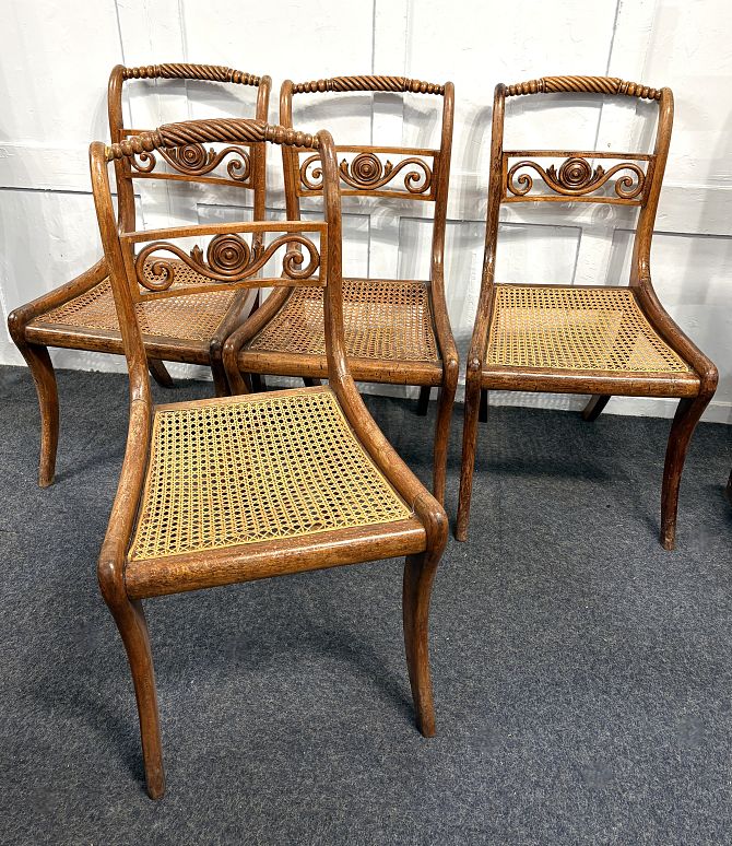 A set of four antique mahogany dining / occasional chairs in the Regency style, featuring rope-twist carved top rails above scrolled open work back splats, and caned seats, raised on sabre legs.