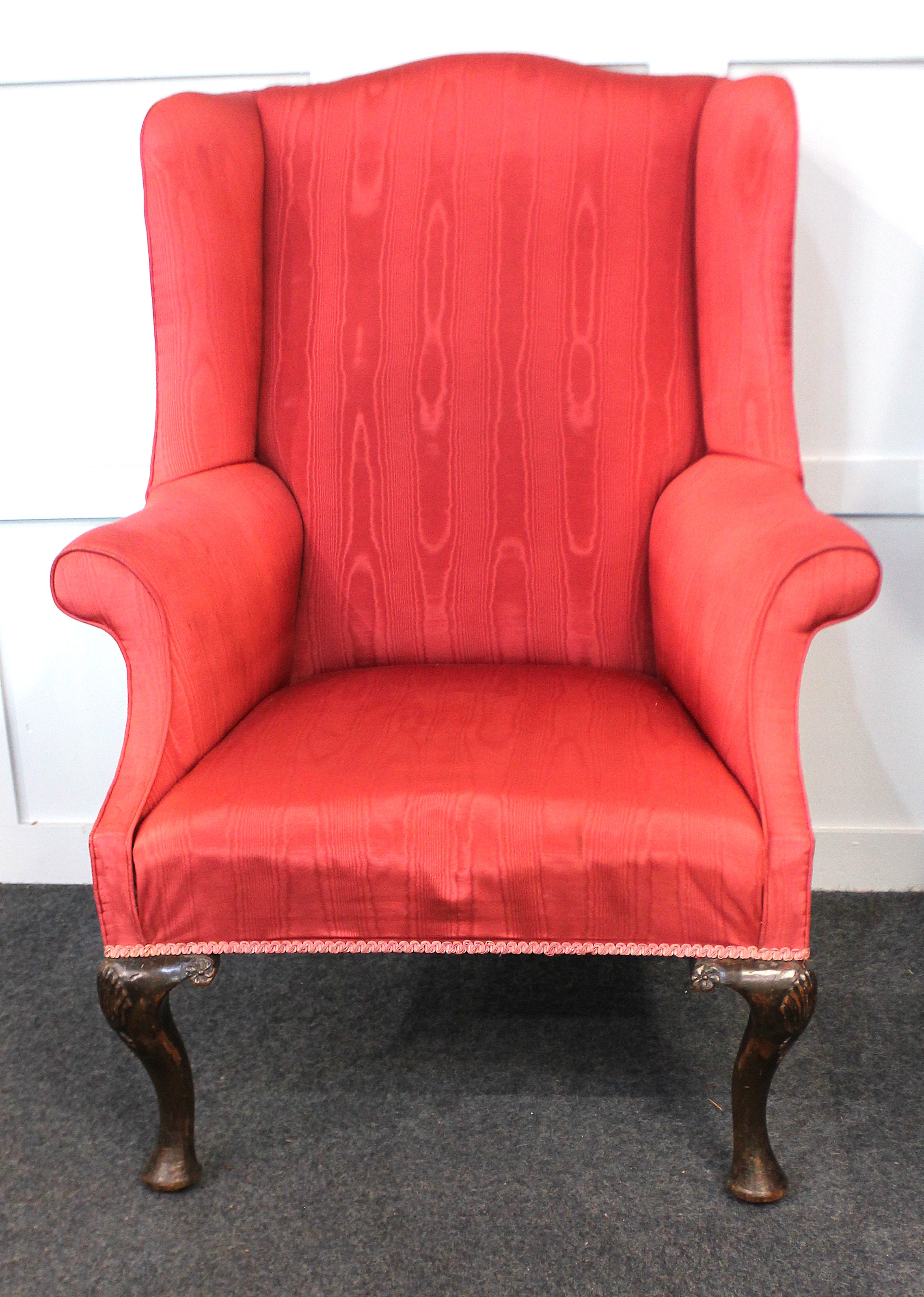 A Georgian style wingback armchair on shell-carved cabriole front legs
