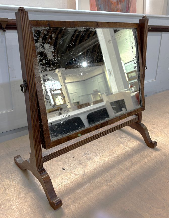 A 19th century rectangular mahogany toilet mirror with reeded supports on outswept legs, mirror plate 28cm by 39cm