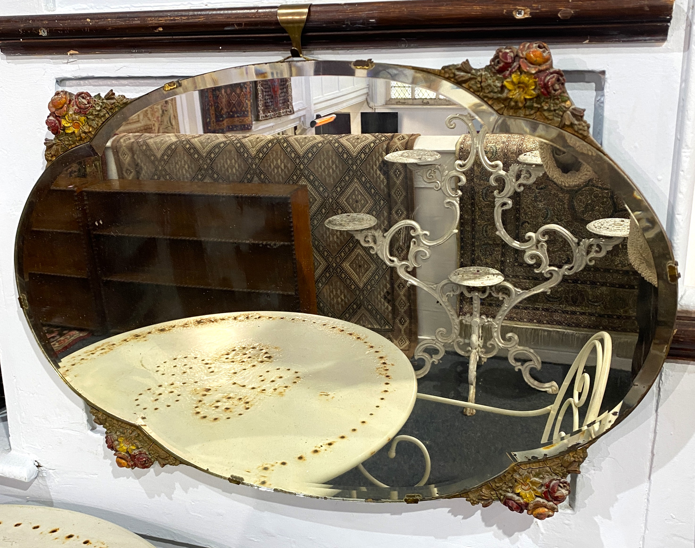 A vintage wall mirror with painted floral carved wood frame, 49cm by 73cm