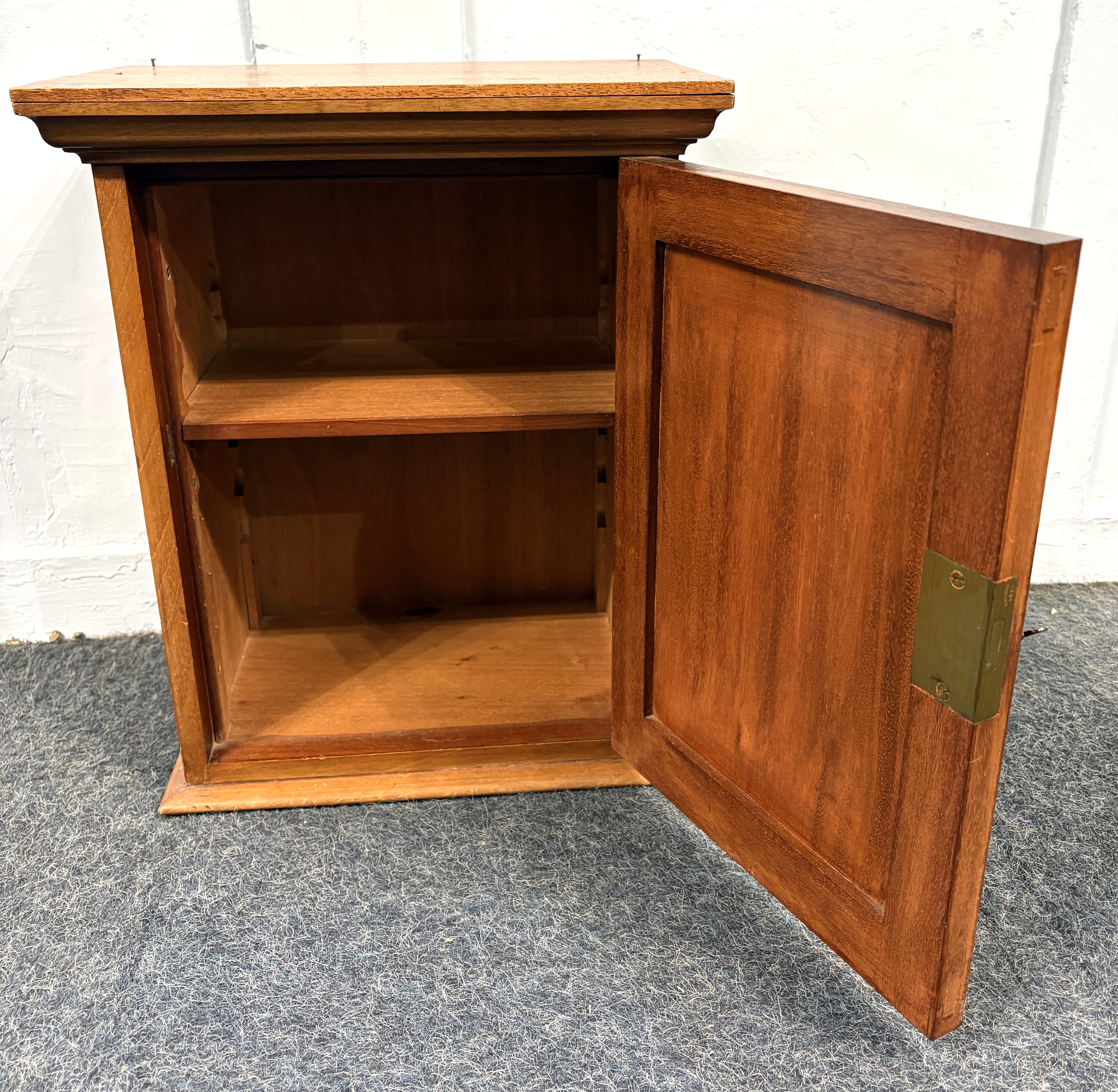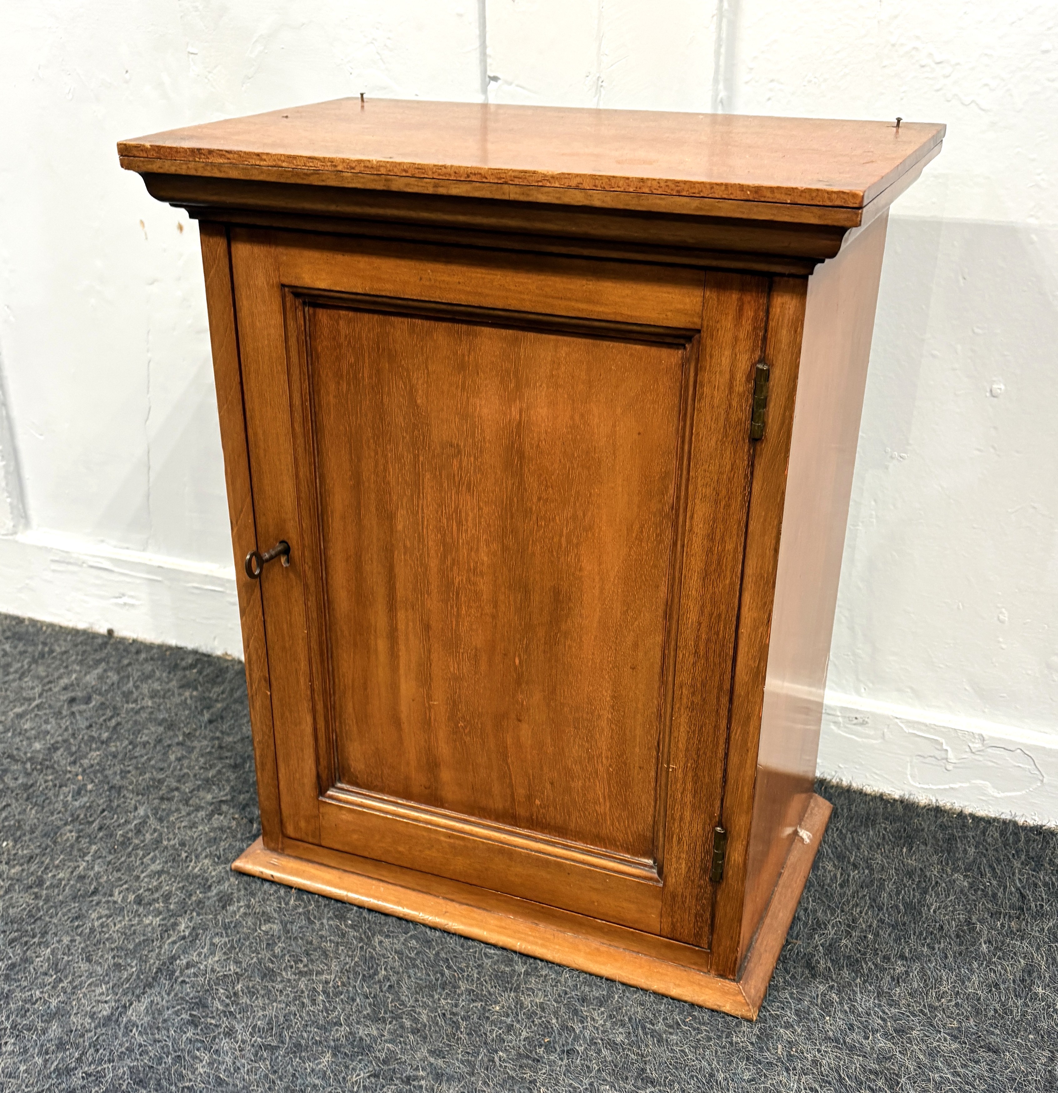 An Edwardian walnut apprentice's type cabinet, having a panelled door enclosing an adjustable shelf, raiswd on a plinth base, 36cm wide by 23cm deep by 44cm high.