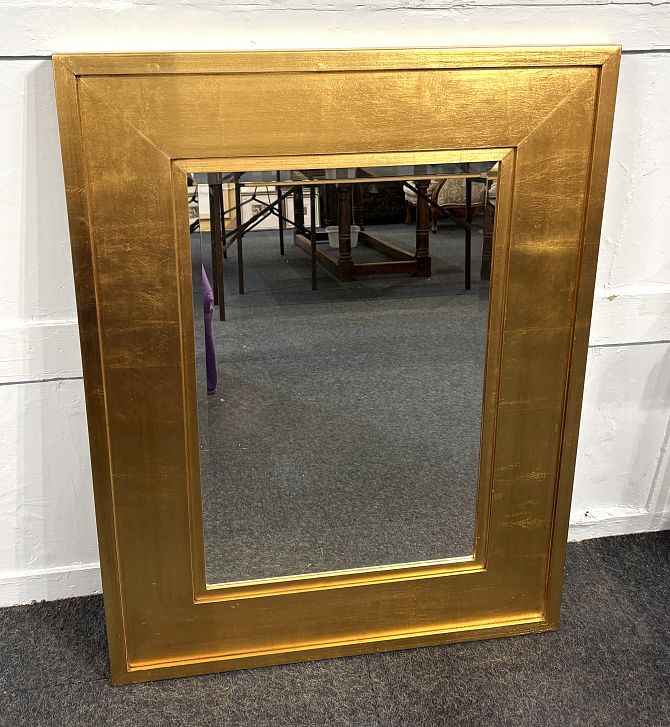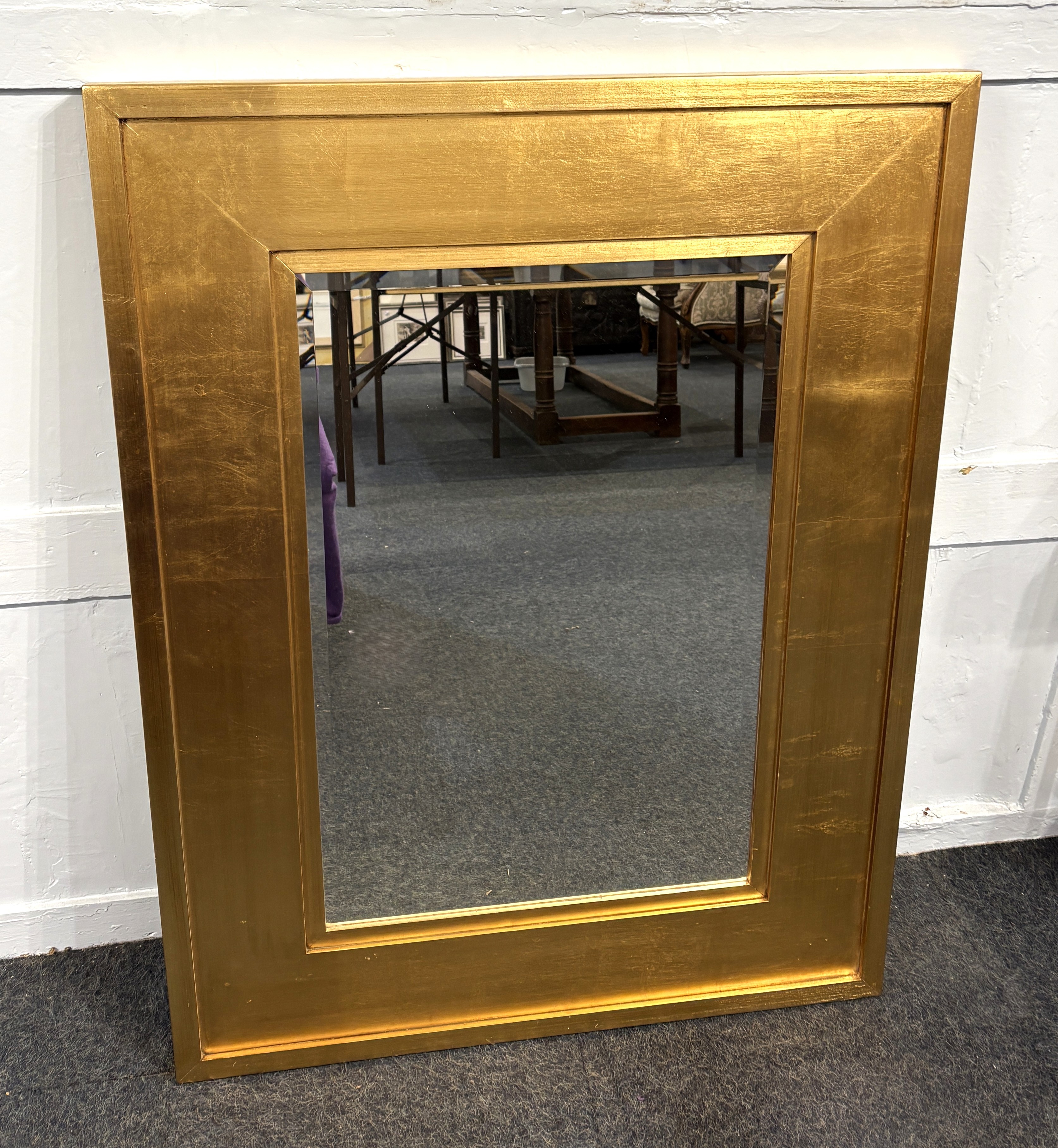 A large decorative rectangular wall mirror with wide lacquered gold leaf decorated frame and bevelled mirror plate, mounted for display in both portrait and landscape orientation, 110cm by 84cm