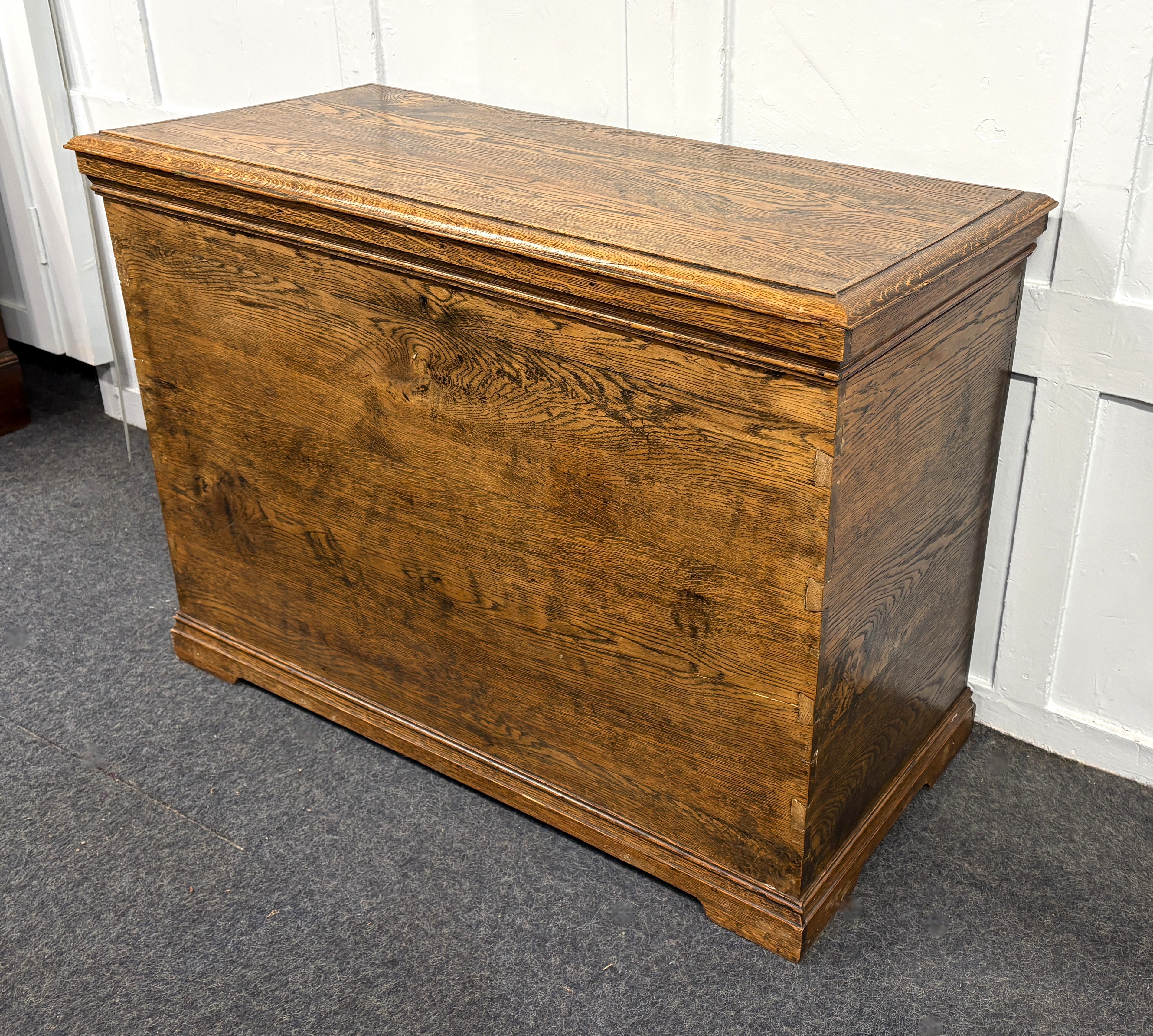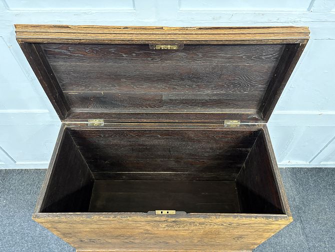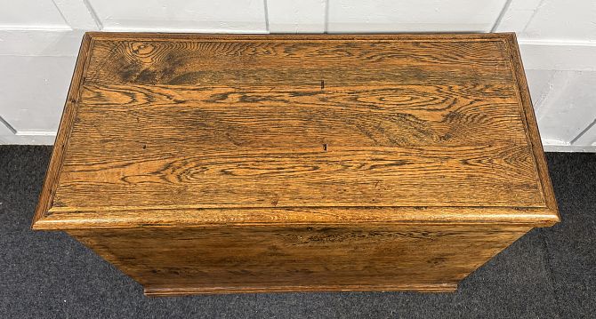 A vintage medium oak blanket chest, early 20th century, with hinged lid enclosing lots of storage space, raised on shallow bracket feet, 103cm wide by 49cm deep by 75cm high.