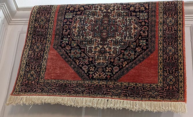 A Persian style rug with central panel of winged lozenge shapes on a blue field ...