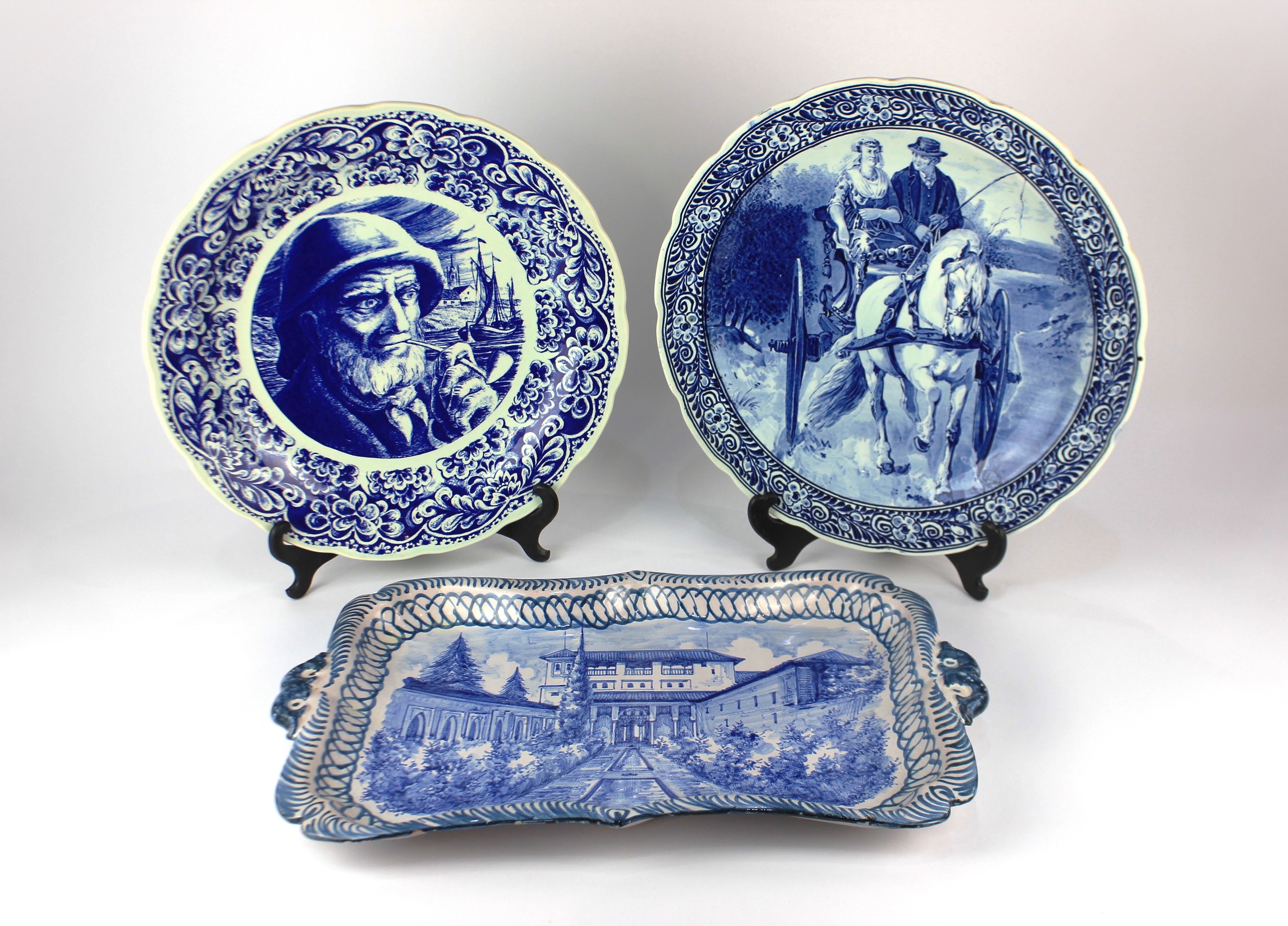 A Belgian Delft style blue and white charger by Boch Freres Keramis decorated with a fisherman 40cm diameter, a Royal Sphinx Delfts blue and white charger decorated with a couple riding a horse and cart 39.5cm, and a continental blue and white glazed earthernware dish 52cm