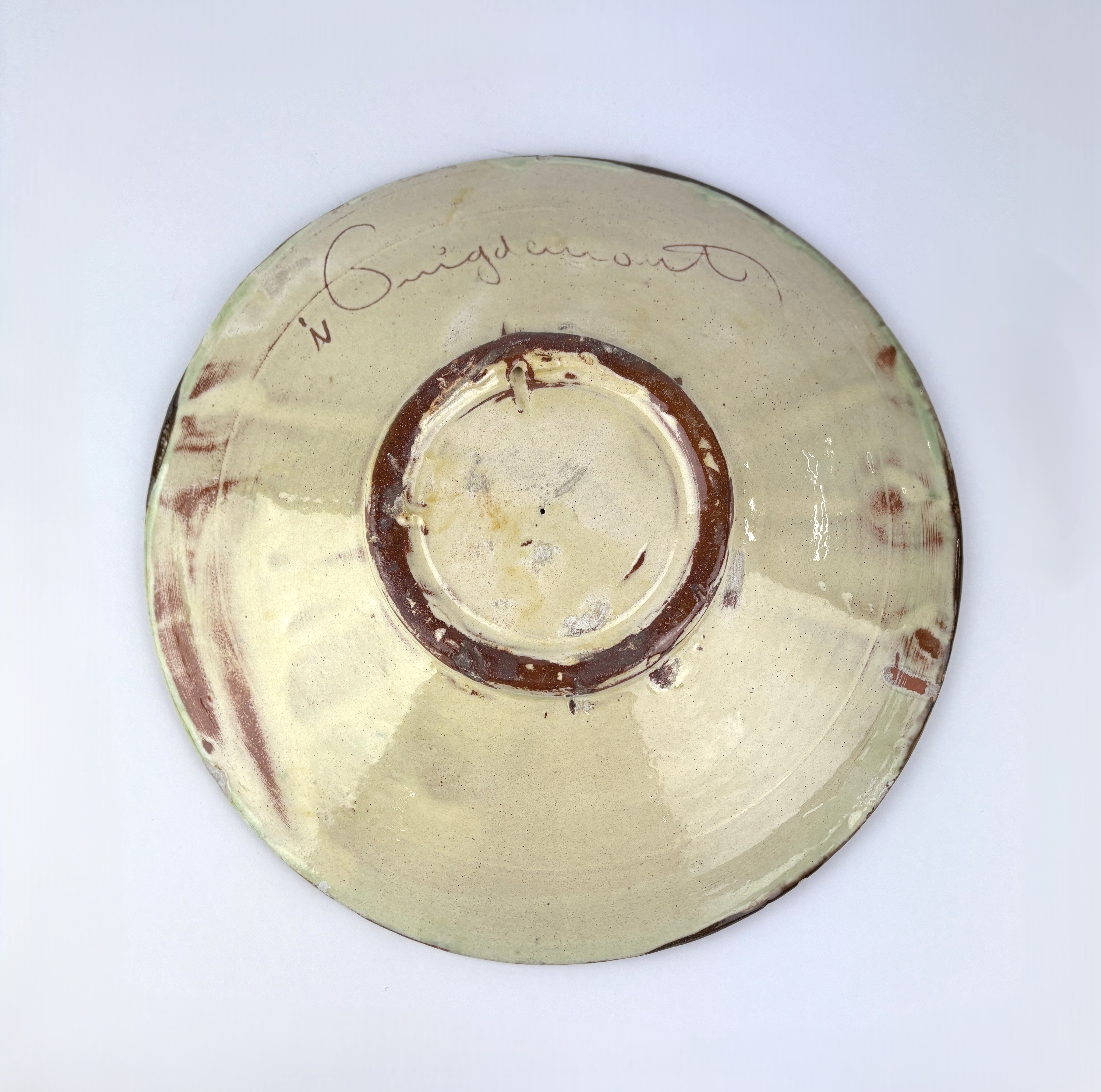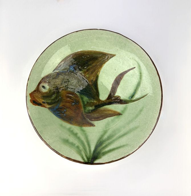 A Puigdemont studio pottery shallow bowl decorated with a fish, signature to base, 24.5cm diameter