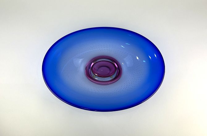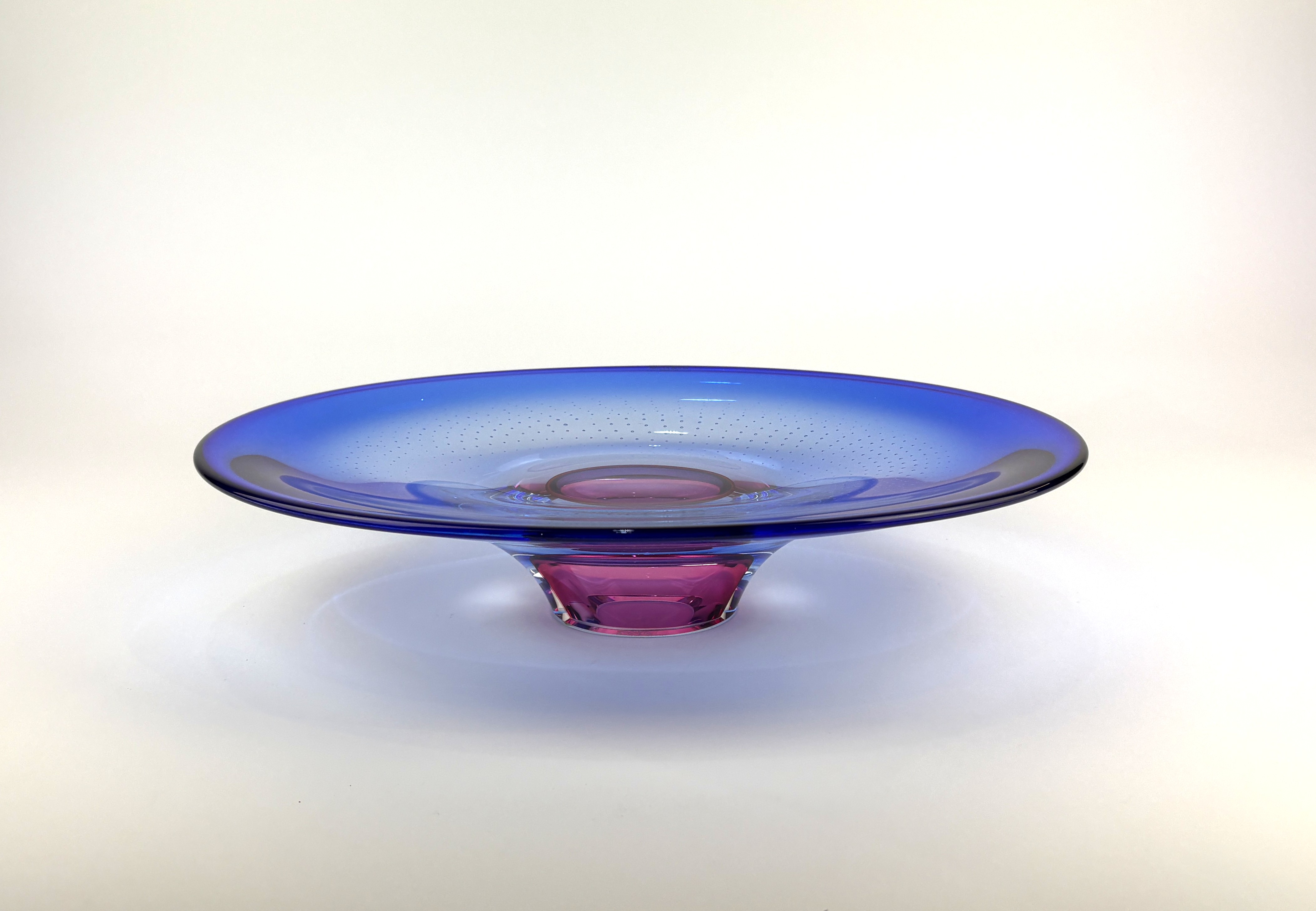 Goran Warff for Kosta Boda: A blue and pink glass centrepiece dish, signed to base 'Kosta Boda, G. Warff, 7079910', bearing makers label, within origal packaging, width 34cm