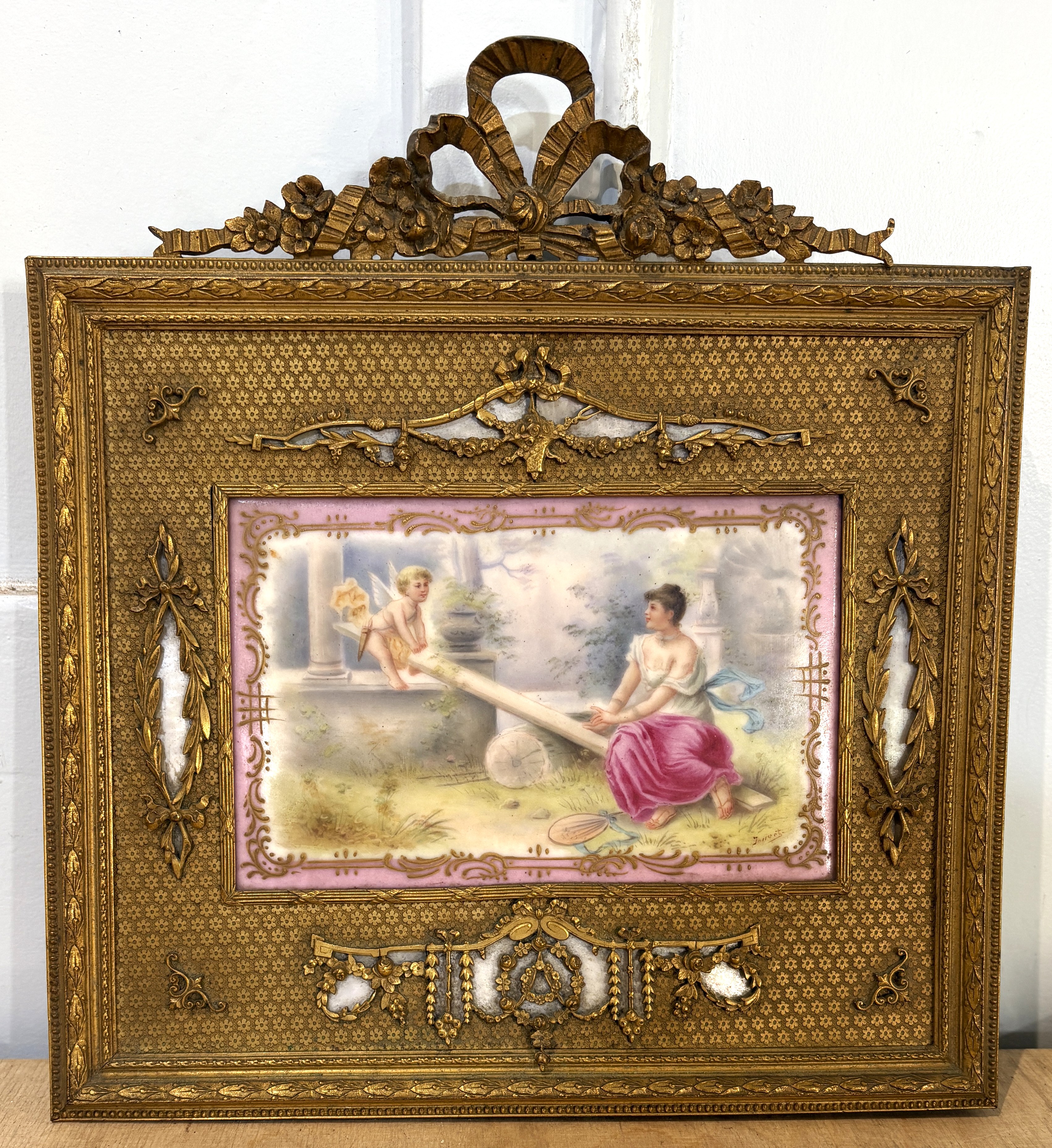 A French painted porcelain plaque depicting cupid and a maiden on a seesaw in a classical garden setting, indistinctly signed, late 19th / early 20th century, inset ornate neo classical revival gilt metal frame, frame 24cm high by 22cm wide.