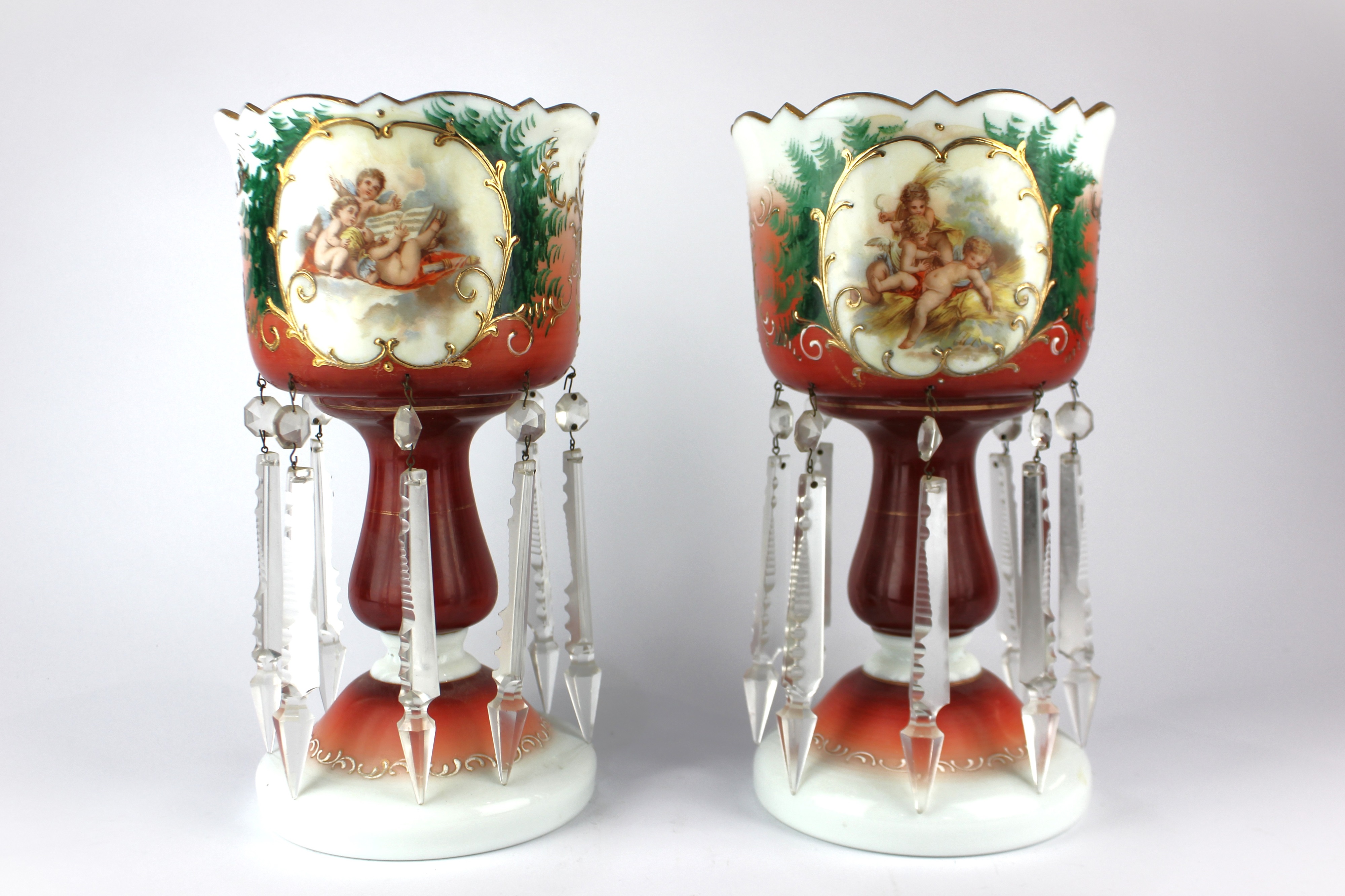 A pair of 19th century opaque glass table lustres, decorated with opposing panels of cherubs, and applied with cut glass prism drops, 30cm high.