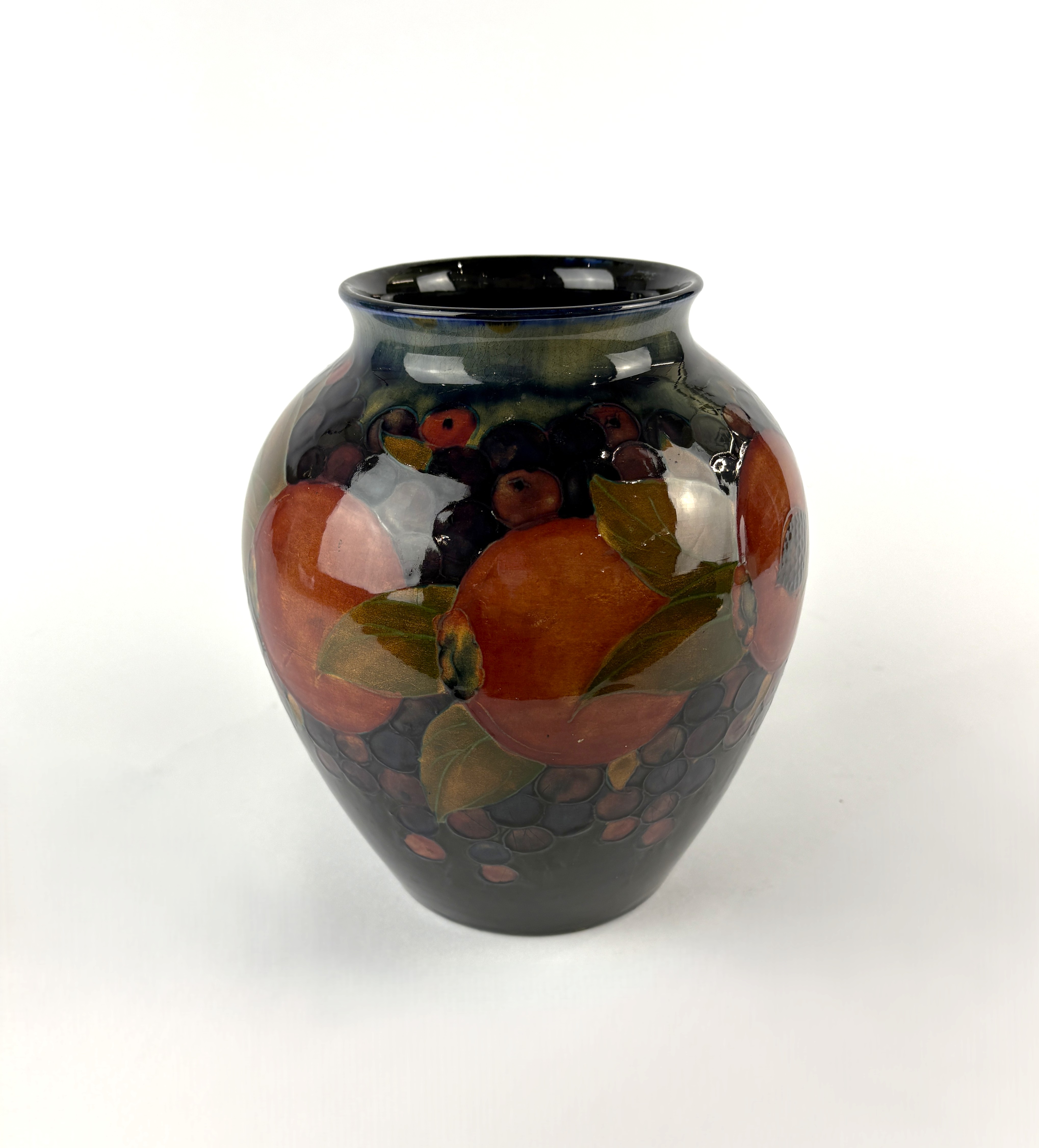 A William Moorcroft / Moorcroft pottery 'Pomegranate' pattern vase, early 20th century, decorated dark blue ground, signed W. Moorcroft, impressed marks to base 'Moorcroft, Burslem, England. 189', height 21.5cm (AF)