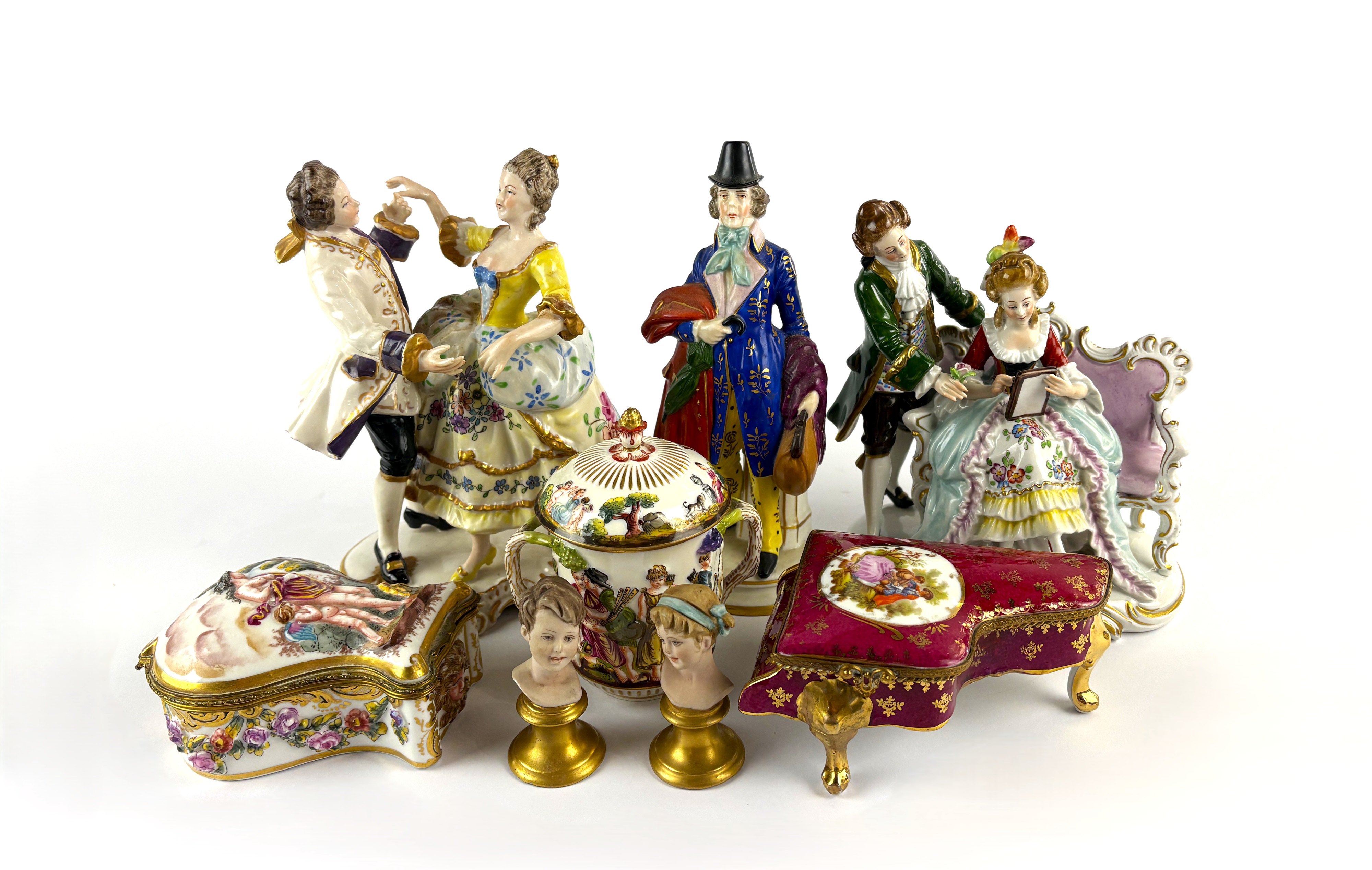 A collection of Naples porcelain comprising chocolate pot and cover, trinket pot, a pair of portrait busts and a model of a courting couple, together with a Limoges gilt metal mounted trinket pot in the form of a piano, and two Continental porcelain figures