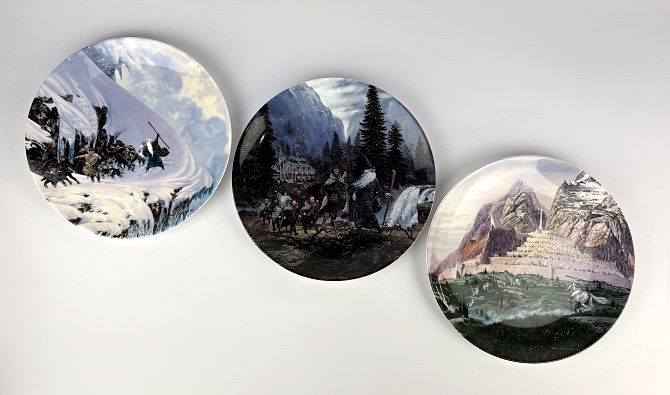 A set of three Danbury Mint Wedgwood Lord of the Rings plates, by Ted Nasmith, including; The Anger of the Mountain, Leaving Rivendell and Dawn at Minas Tirith, two with certificates, each 20cm diameter