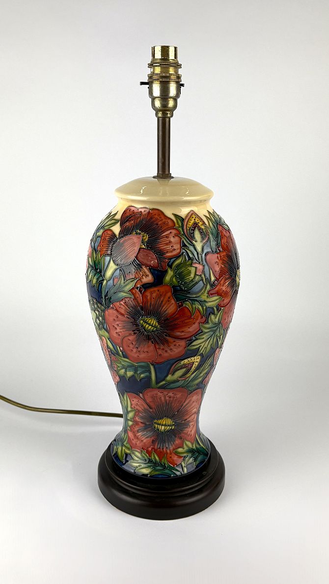 A Moorcroft 'Pheasants Eye' pattern table lamp, designed by Shirley Hayes, on wooden base, height overall 47cm