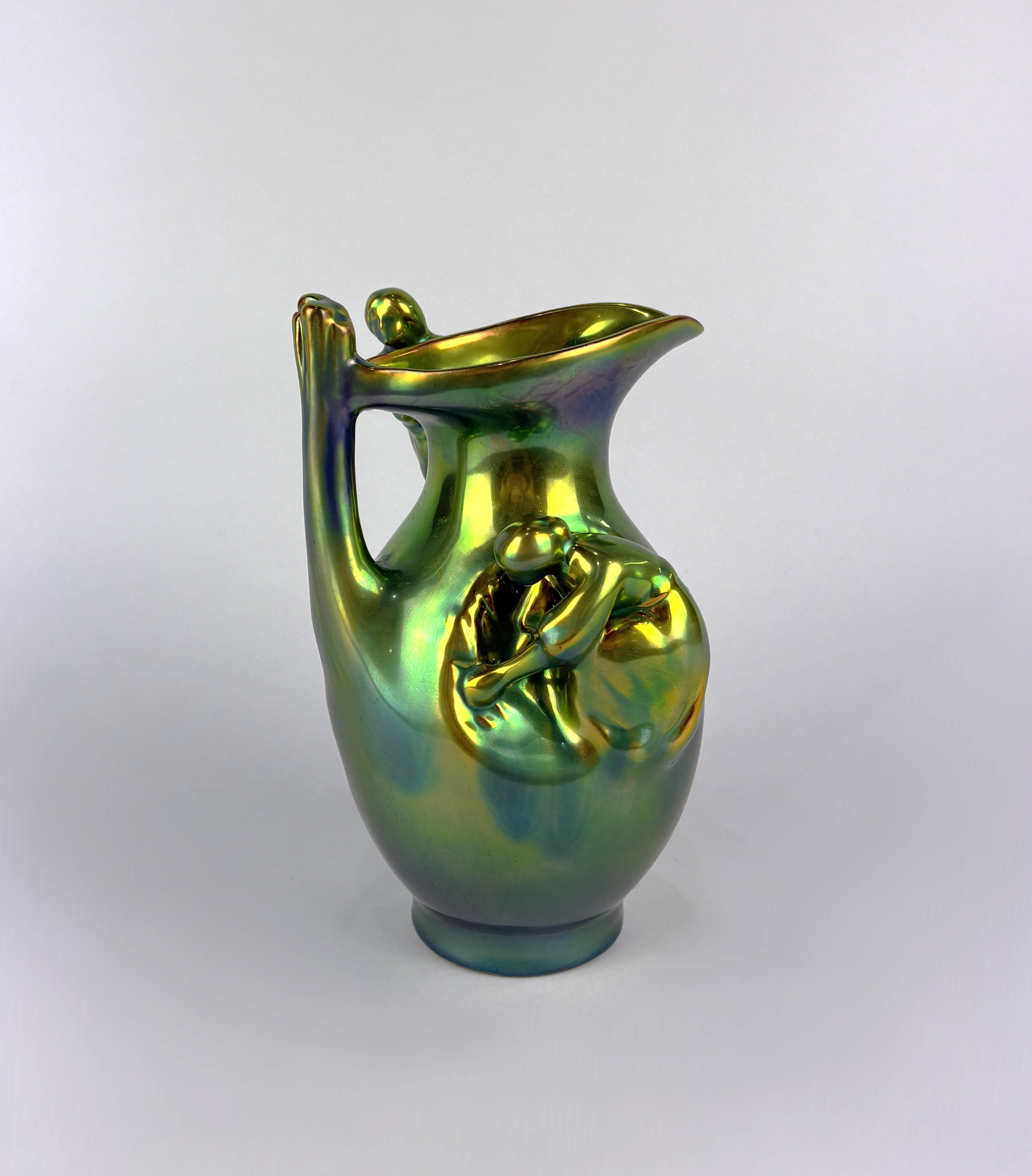 A Zsolnay Pecs Art Nouveau iridescent glazed porcelain jug modelled with two figures, printed marks to base, 17cm high