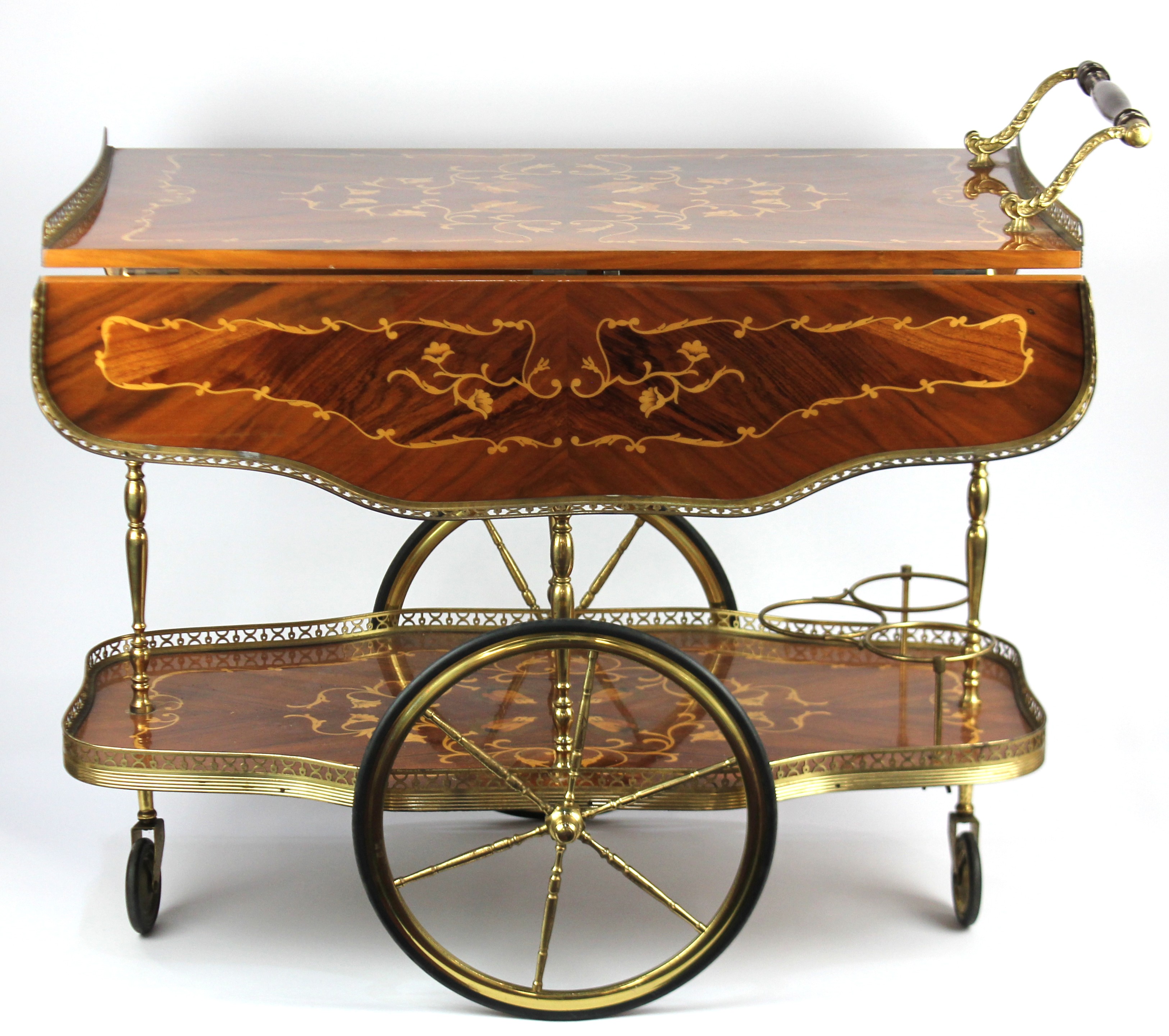 A vintage marquetry drop leaf drinks trolley, inlaid with a floral motif, two-tier with brass gallery, raised on two large and two small wheels, length to handle 83cm