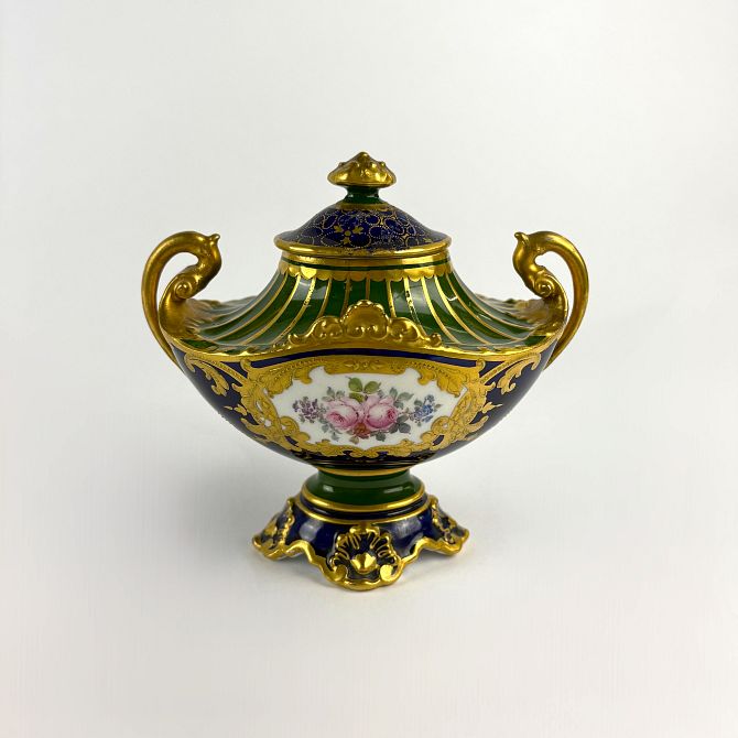 A Royal Crown Derby porcelain two handled vase and cover, with floral panel and gilt embellishments, 12.5cm high