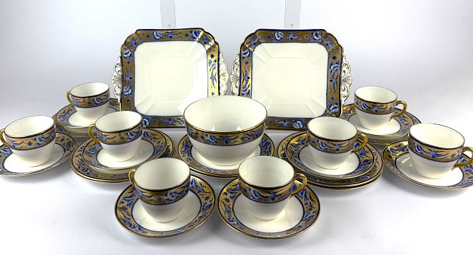 A Shelley china tea set, pattern 8190, with cobalt blue swallow and gilt borders, comprising a pair of platters, slops bowl, eight tea cups and saucers and eight small plates (a/f)