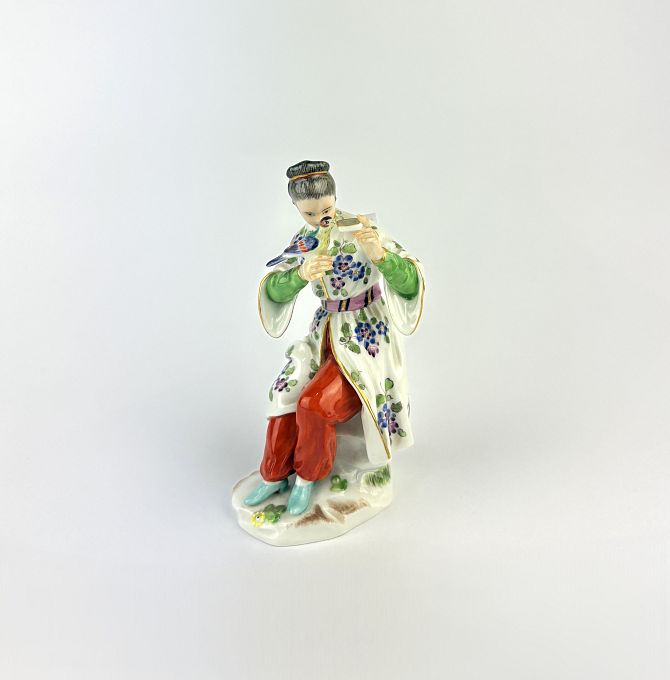 A Meissen Chinoiserie porcelain figure, 20th century, in the form of a Japanese style female figure seated with exotic bird and water dish, gilt heightened, blue crossed swords mark to base, impressed number 656451, height 13.5cm