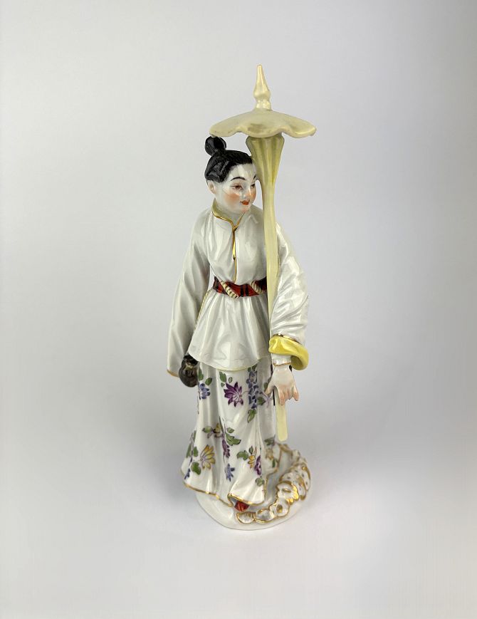 A Meissen Chinoiserie porcelain figure, 20th century, in the form of a Japanese female holding a parasol, gilt heightened, blue crossed swords mark to base, impressed number 65645 and 1070, height 18.5cm