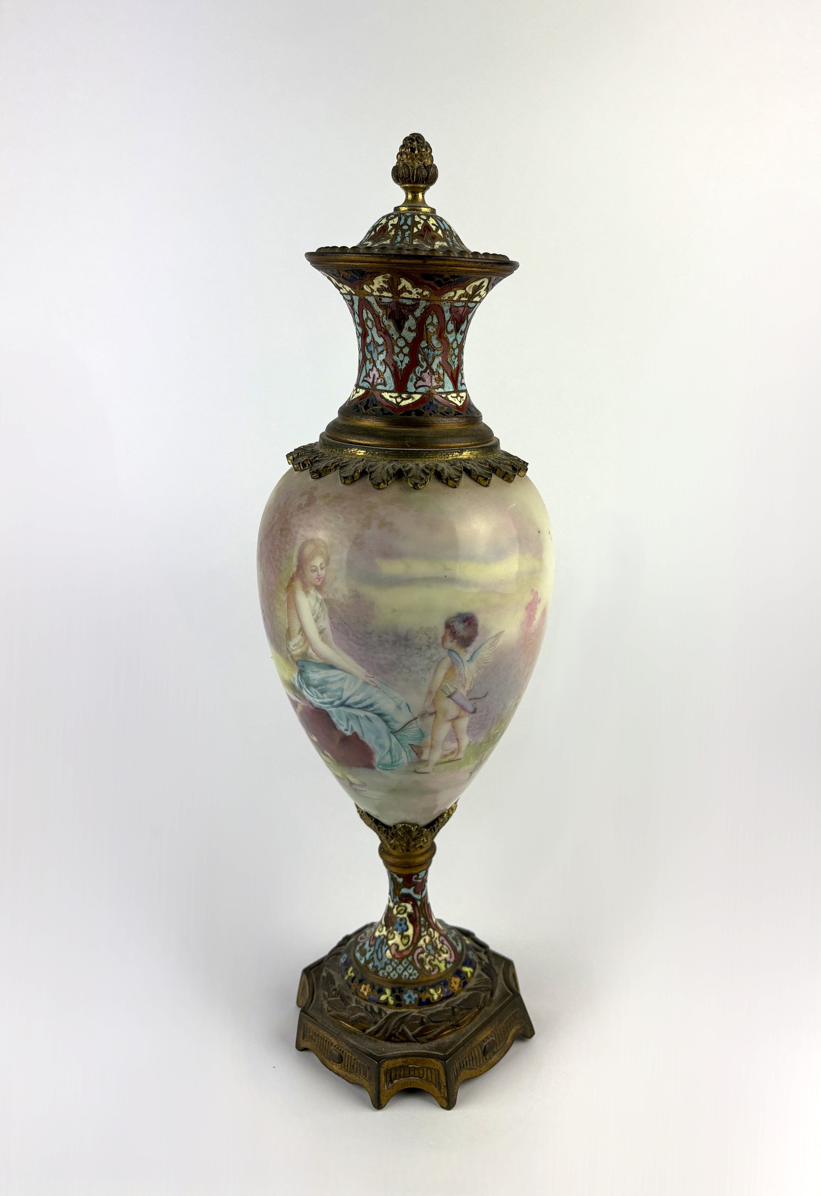A 19th century champleve enamel and gilt metal mounted porcelain covered vase, hand painted to both sides with a scene of cupid and a maiden and a classical landscape, 31cm high.