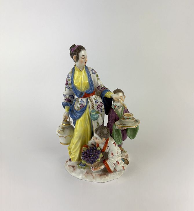 A Meissen Chinoiserie porcelain figure group, 20th century, in the form of a Japanese female figure standing pouring tea, with two child attendants, gilt heightened, one holding a tea cup and saucer, the other with a basket of fruit, blue crossed swords mark to base, impressed number 65644 and 7280, and painted '22', height 17cm