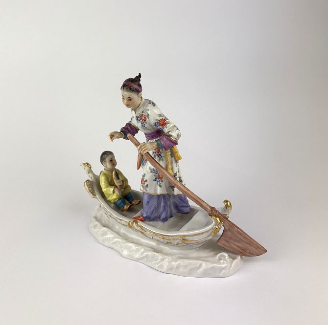 A Meissen Chinoiserie porcelain figure group, 20th century, after Johann Joachim Kandler, in the form of a female figure standing within a boat, with seated child holding a fish and crane standing to her right, gilt heightened, blue crossed swords mark to base and painted '7', height 15cm