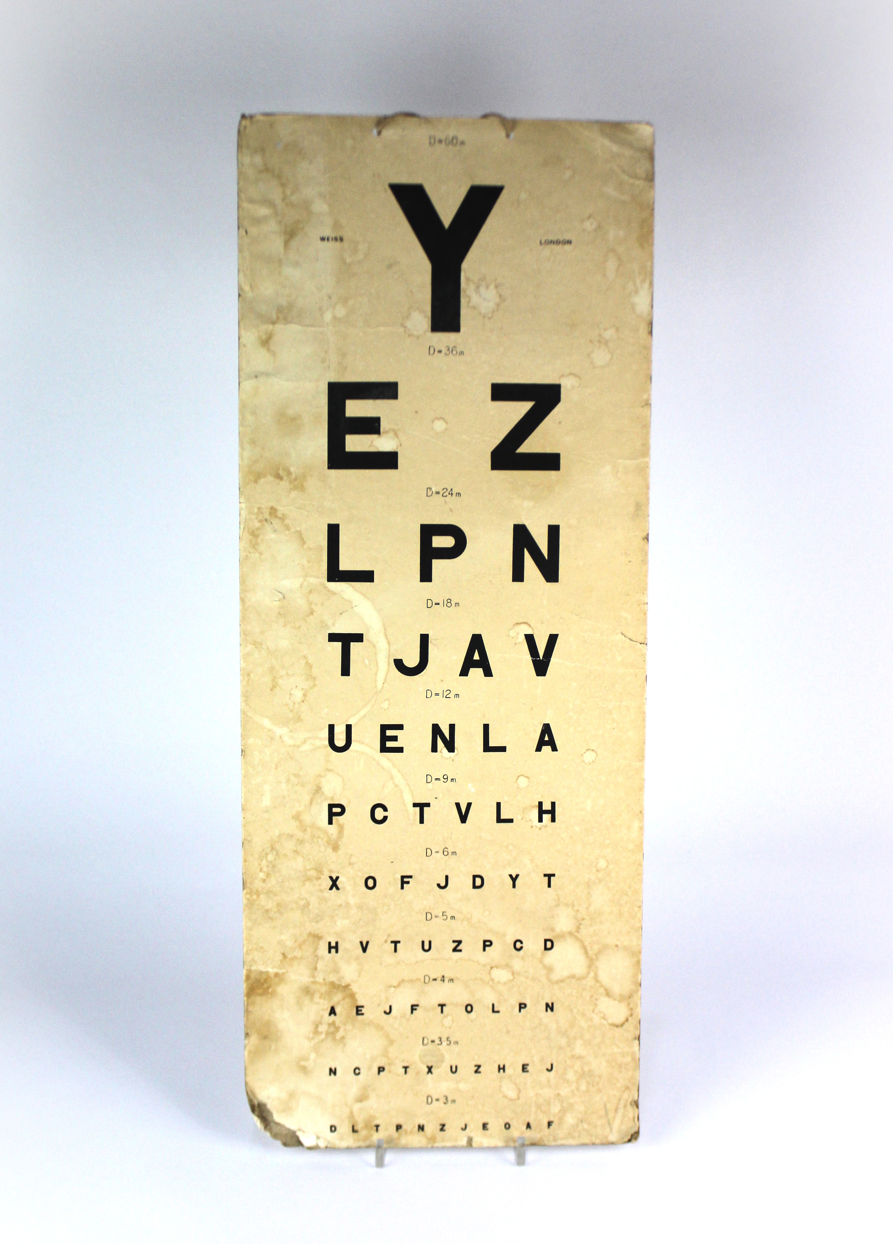 A vintage opticians eye chart published by Weiss London, paper mounted to card, with string hanging loop, height 63cm (AF)