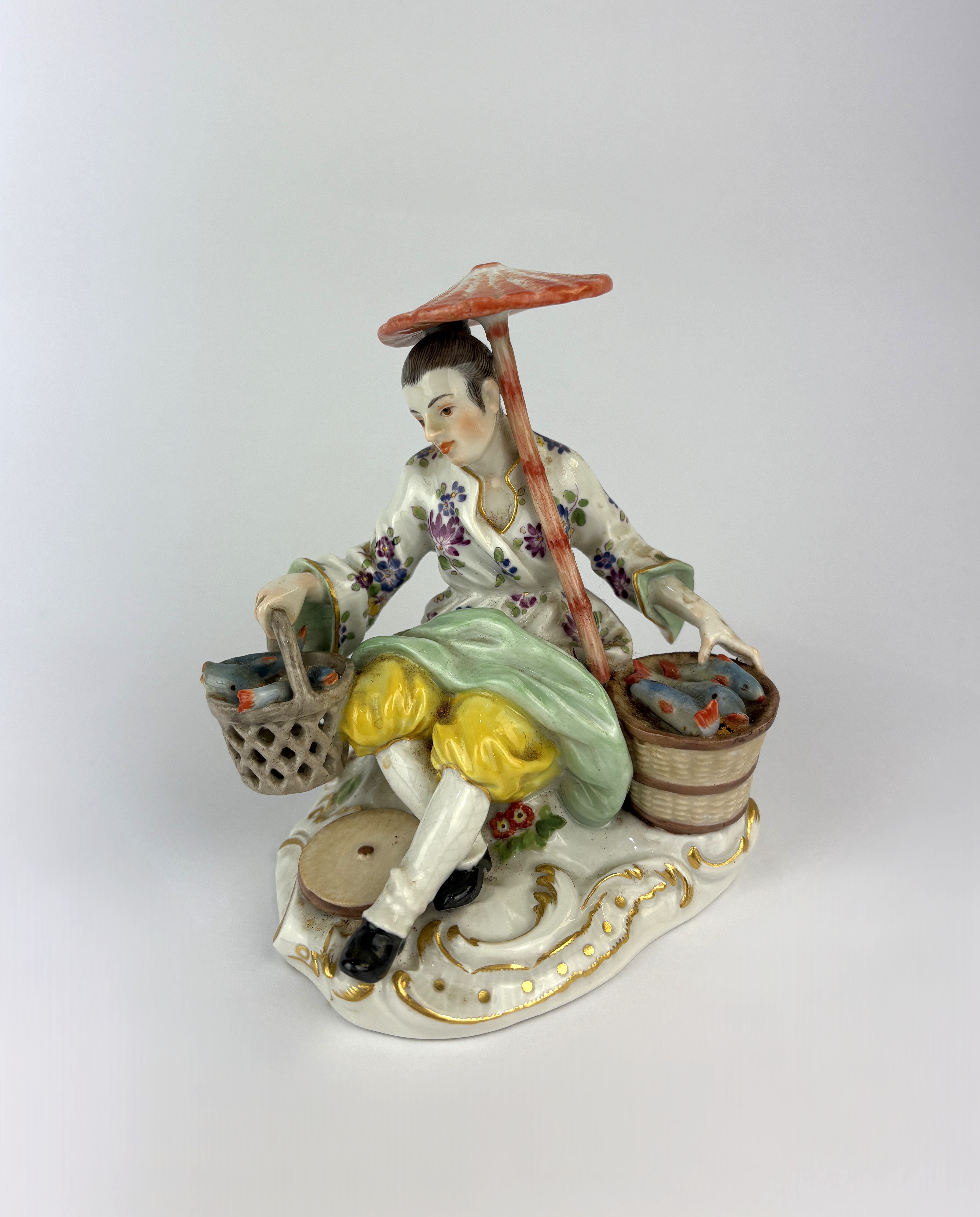 A Meissen Chinoiserie porcelain figure group, 20th century, in the form of a seated fish seller with parasol, gilt heightened, blue crossed swords mark to base, impressed number 65639 and 1285, height 13.5cm
