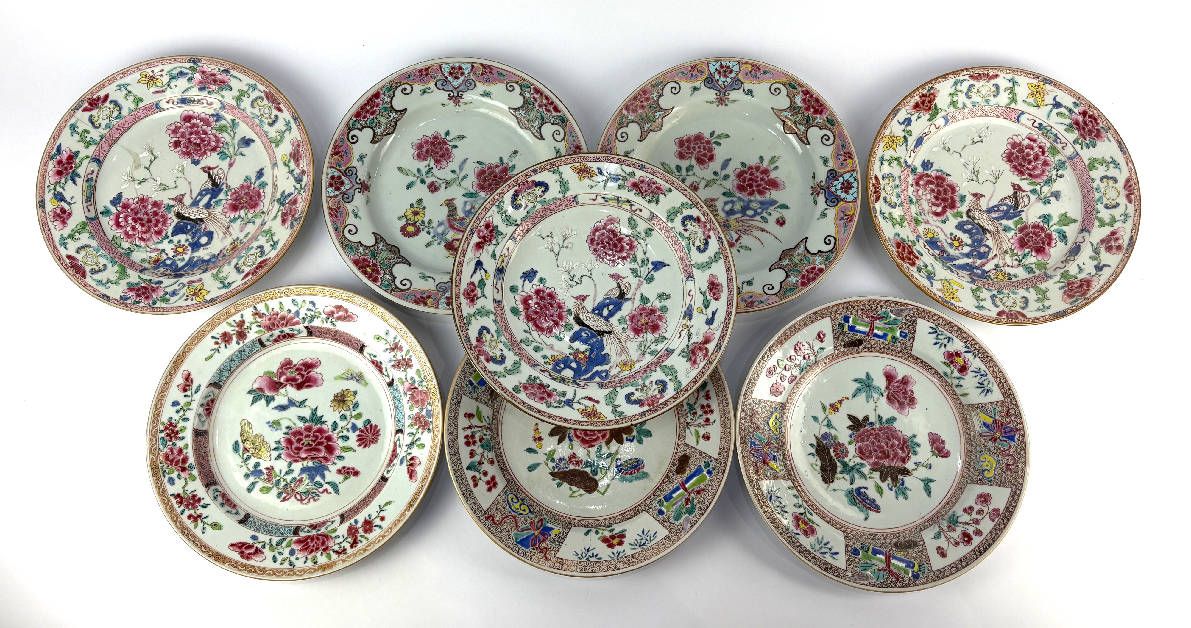 A mixed collection of eight Chinese famille rose porcelain plates, each decorated in polychrome enamels with floral and bird motifs, diameter 22.5cm (8)
