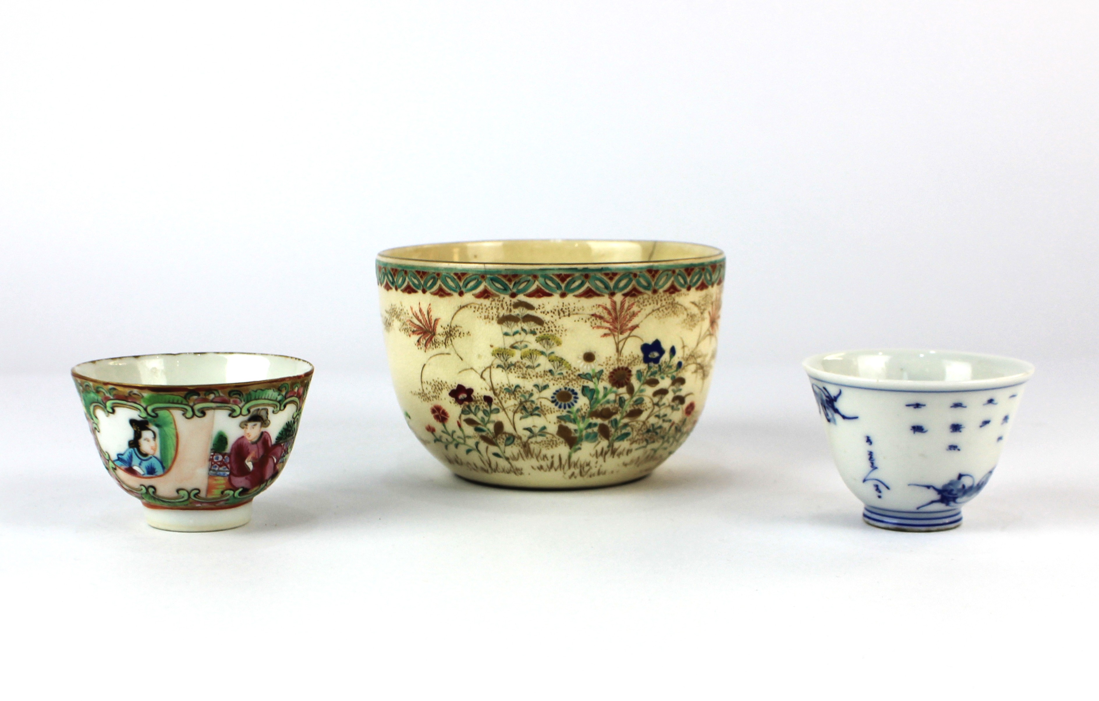 A Chinese Cantonese famille rose porcelain tea bowl 4.5cm high, a Chinese blue and white porcelain tea bowl bearing a Qing Dynasty style mark 4.5cm high, and a Japanese Satsuma ware bowl 7cm high (a/f)