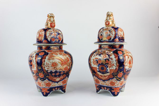A pair of Japanese Imari covered vases, early 20th century, decorated in iron red and gilt over underglaze blue with traditional foliate and bird designs, mounted with temple dog finials, 36cm high, (one small rim chip).