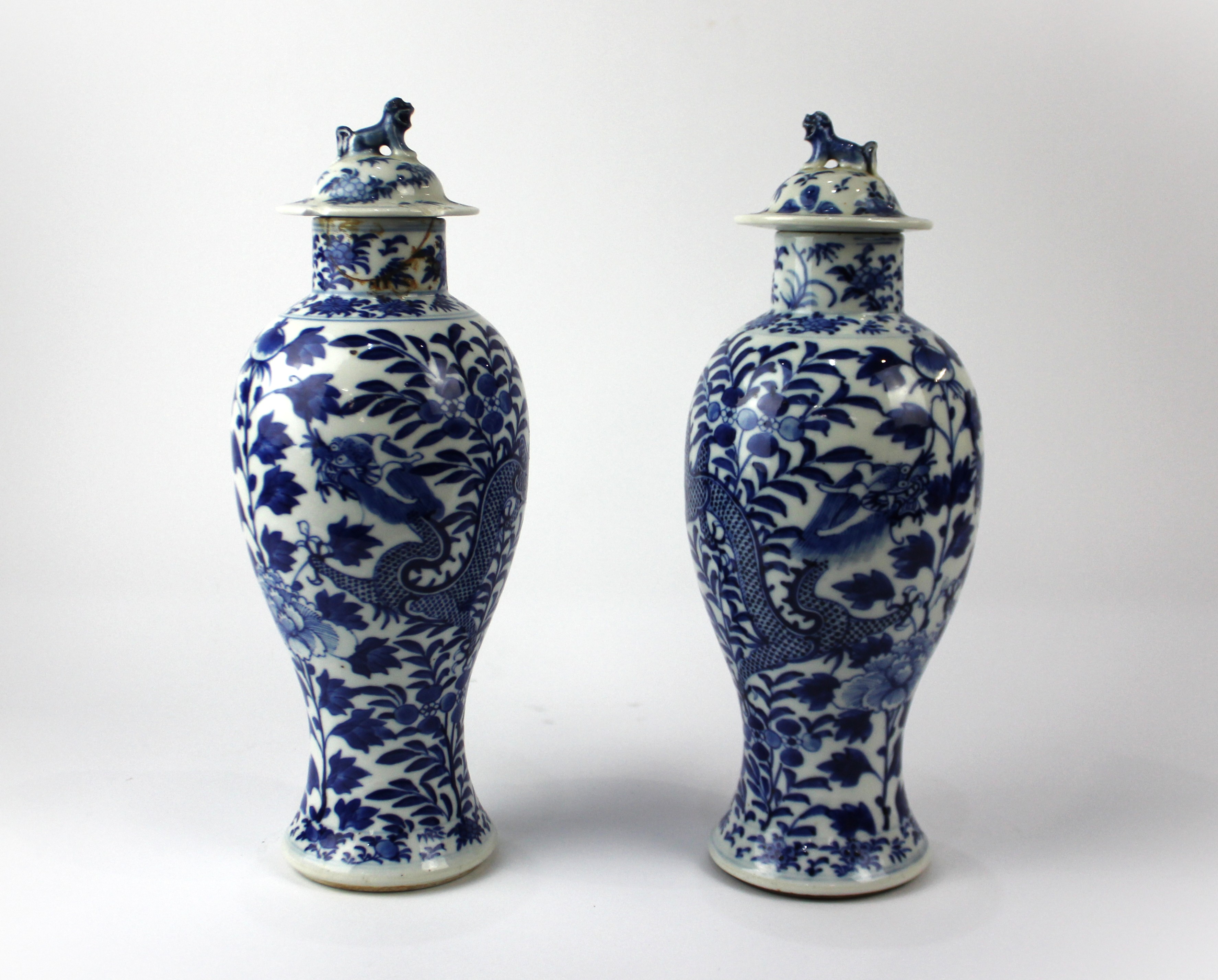 A pair of Chinese blue and white porcelain covered vases, probably 19th century, painted underglaze with dragons and foliage, undersides with four character marks, 32cm high, (af).