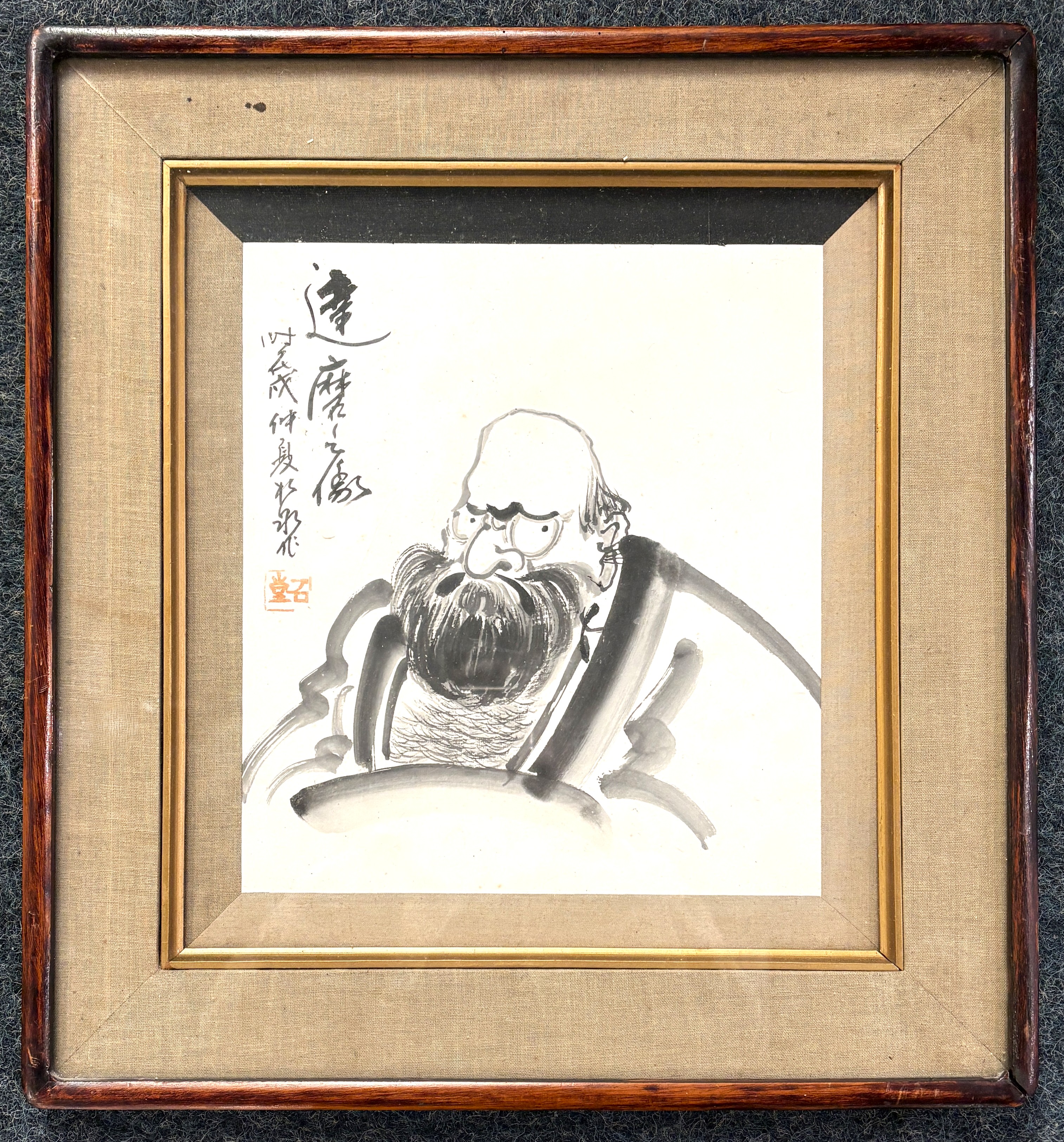 Japanese School (20th century) portrait of Daruma, ink and wash, with two lines of calligraphy and red seal mark, framed and mounted, 26.5cm x 24cm